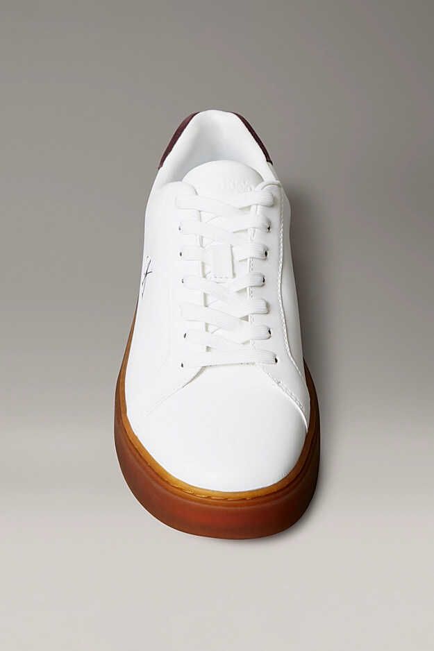 Zamansız kort ayakkabısı silüetini modern detaylarla buluşturan bu spor ayakkabı, beyazın ferahlığını bordo ve bal rengi detaylarla harmanlıyor. %100 deri dış yüzeyi, hem dayanıklılık sunar hem de pürüzsüz dokusuyla premium bir stil yaratır. Tasarımın en dikkat çekici özelliği olan yarı saydam bal rengi (Gum) taban yapısı, klasik beyaz gövdeye retro ve sıcak bir hava katar. Topuk kısmındaki bordo süet görünümlü detay ve yan taraftaki siyah "cK" logosu, ayakkabının minimalist şıklığını tamamlar. Günlük şehir hayatında hem konforu hem de sofistike bir duruşu arayan erkekler için mükemmel bir tercihtir.
