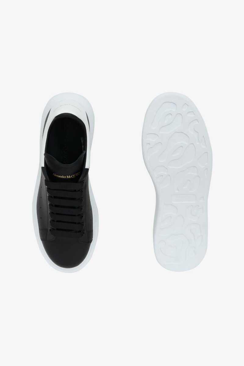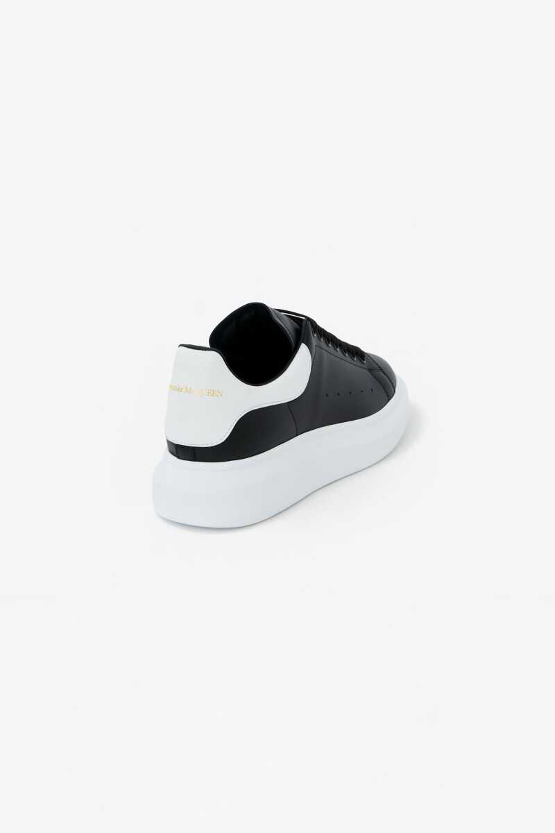 İkonik ve hacimli platform tabanıyla anında tanınan bu sneakers, minimalist lüksü ve modern tasarımı bir araya getiriyor. Üstün kaliteli dana derisinden üretilen pürüzsüz siyah saya, yan kısımdaki perfore (delikli) detaylarla nefes alabilirlik sunar. Tasarımın en belirgin özelliği olan kontrast beyaz renkli topuk pedi ve imzası niteliğindeki hacimli beyaz kauçuk tabanı, ayakkabıya çarpıcı bir görünüm katar. Dil ve topuk kısmındaki altın rengi yazı detayları, bu İtalyan yapımı sneakers'a zarif bir imza atar.