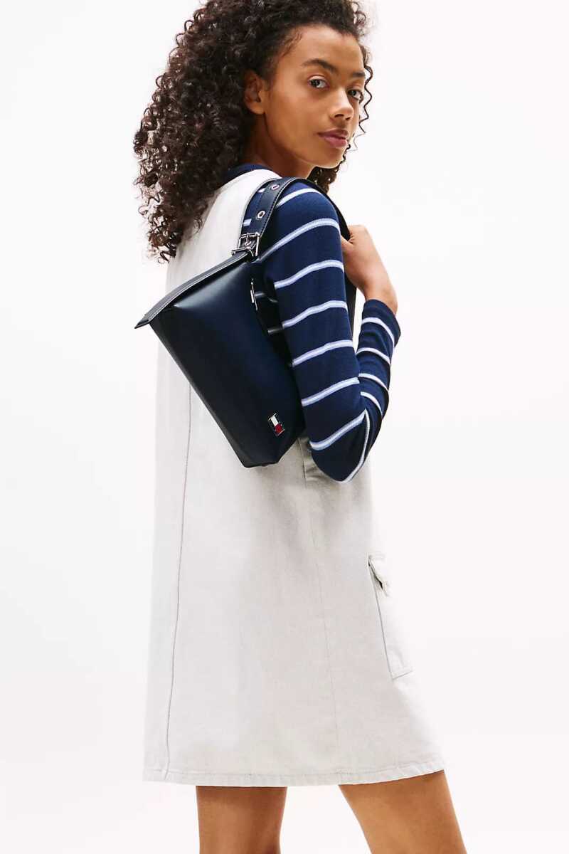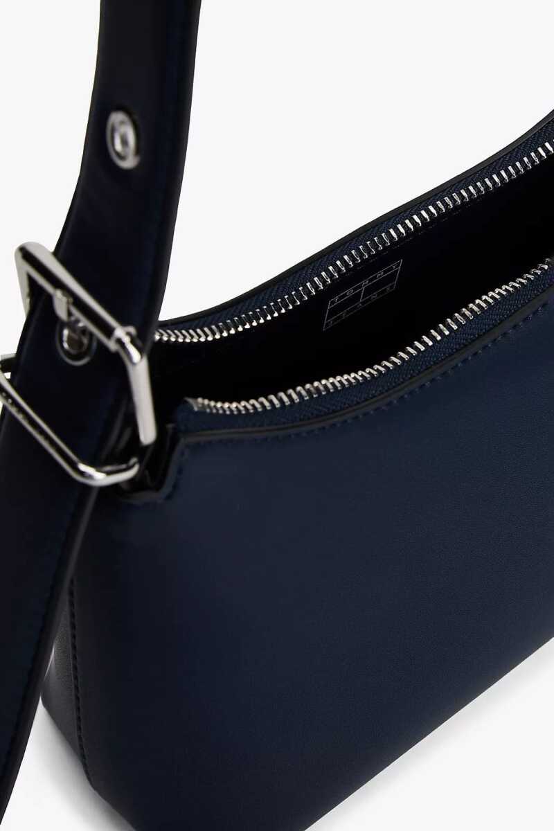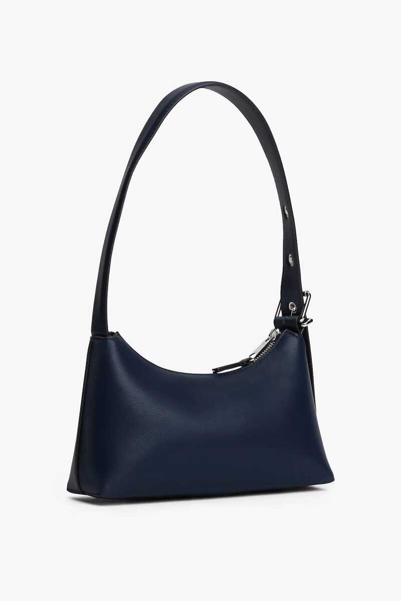 90'ların ikonik stilinden ilham alan bu minimalist baget çanta, her görünüme şık bir dokunuş katıyor. Pürüzsüz poliüretan malzemeden üretilen çanta, zamansız lacivert rengiyle öne çıkar. Omuza tam oturan zarif ve kompakt bir silüete sahiptir. Fermuarlı ana bölmesi temel eşyalarınız için güvenli bir saklama alanı sunarken, ayarlanabilir omuz askısı kişiye özel bir uyum sağlar. Ön yüzündeki küçük metal amblem plakası, tasarıma rafine bir son dokunuş yapar.