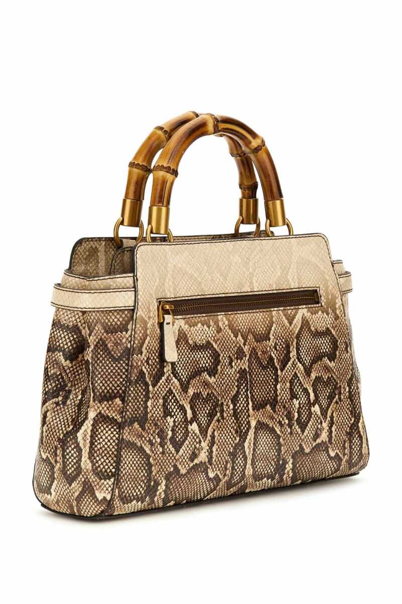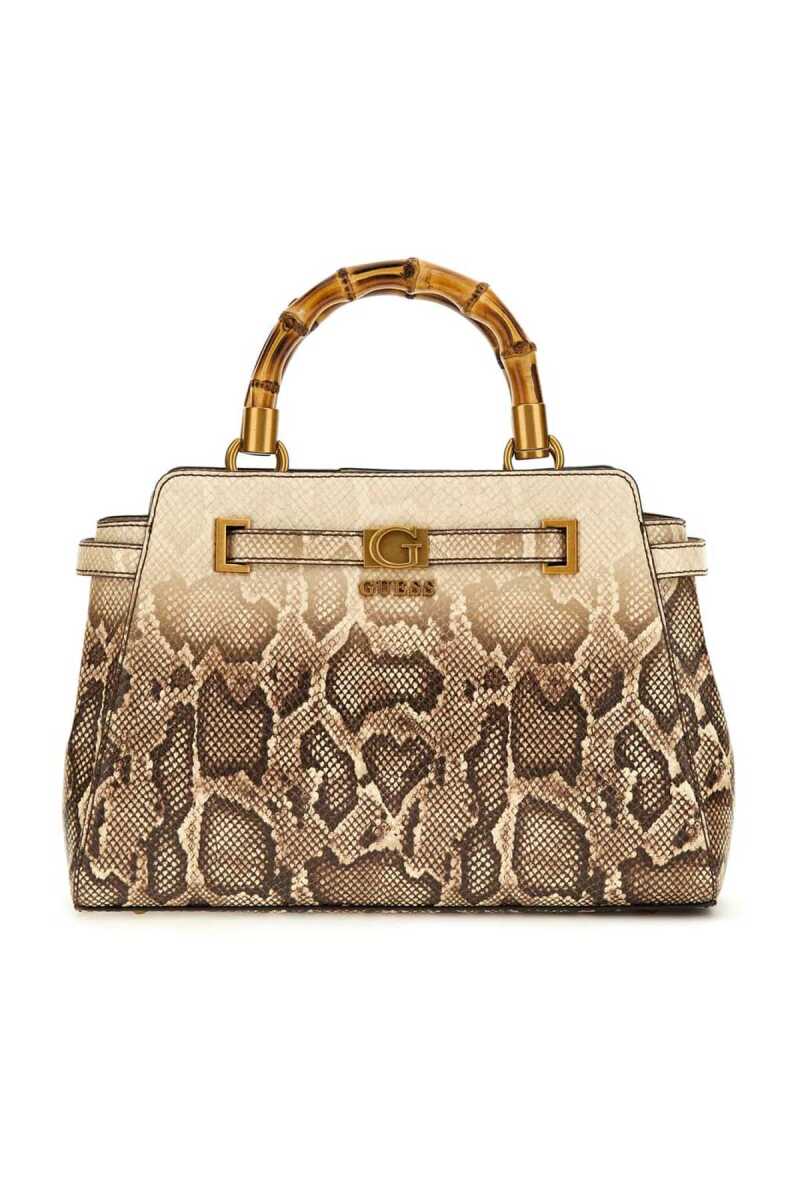 Sofistike ve yapılandırılmış bir silüete sahip olan bu omuz çantası, dikkat çekici yılan derisi deseniyle öne çıkar. Tasarımın en belirgin detayı olan doğal bambu saplar, çantaya özgün ve şık bir hava katmaktadır. Ön yüzde bulunan yatay bant ve ortasındaki metal aksesuar, tasarıma modern bir dokunuş yaparken altın rengi detaylar görünümü tamamlar. Hem elde taşımaya uygun kısa askıları hem de çıkarılabilir uzun askısı sayesinde farklı kullanım stillerine olanak tanır. Arka yüzeyinde kullanışlı bir fermuarlı cep bulunmaktadır.