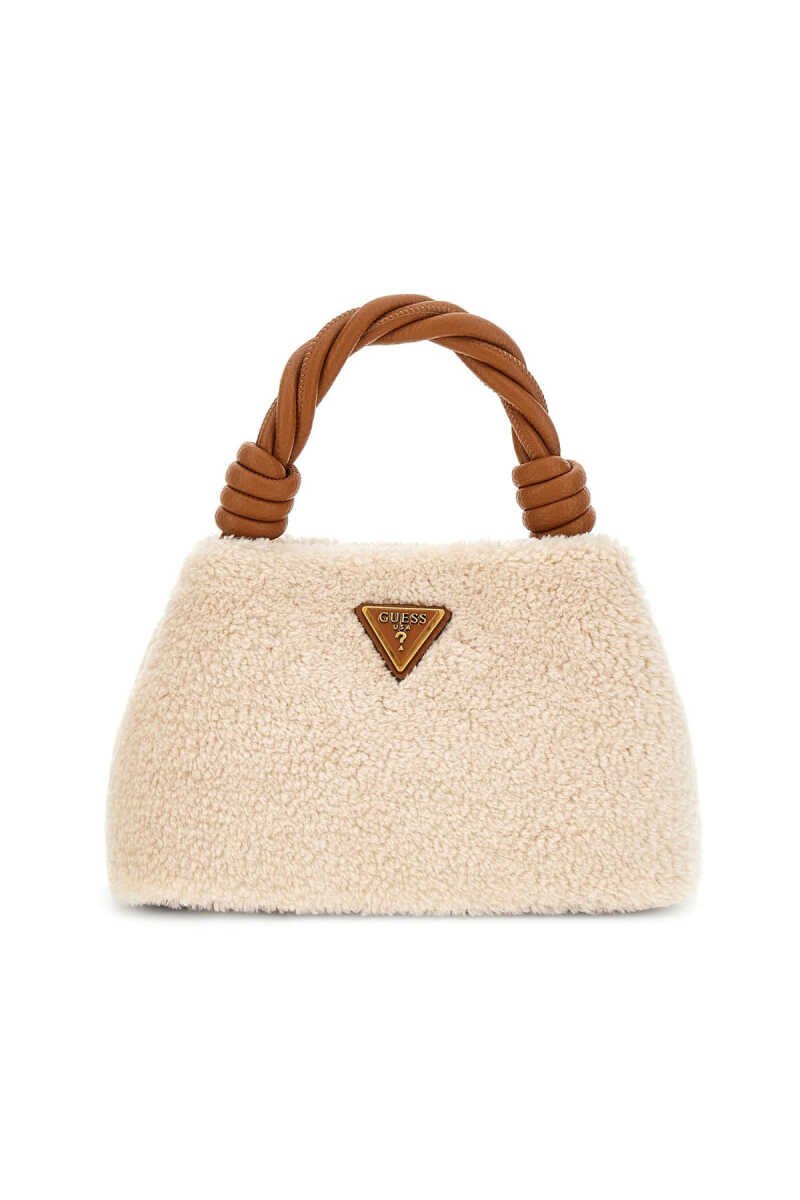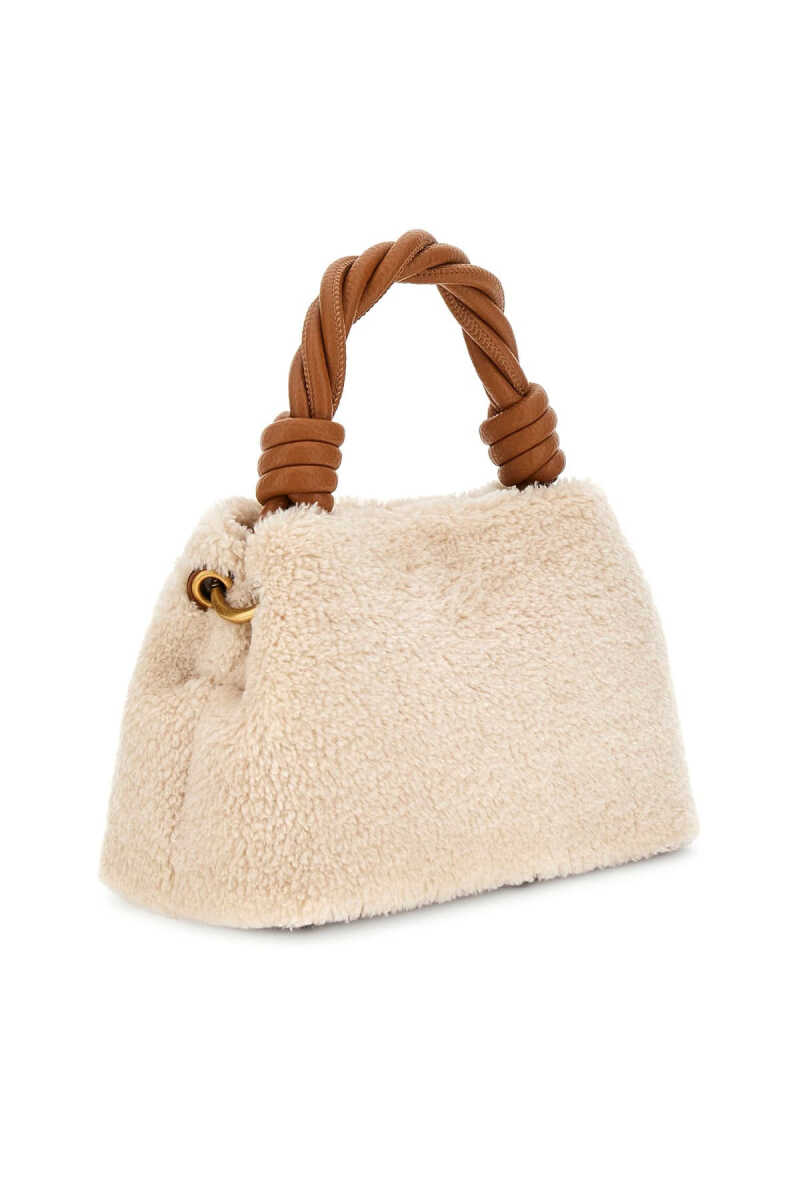 Yumuşak ve dokulu bir tasarıma sahip bu çanta, kürk görünümlü pelüş yüzeyiyle stilinize sıcak bir dokunuş katar. Taba rengi, burgu detaylı modern taşıma sapı, çantanın yumuşak krem rengi formuyla şık bir kontrast oluşturur. Ön yüzeydeki üçgen formlu metal aksesuar, çantanın sevimli ve şık karakterini tamamlar.