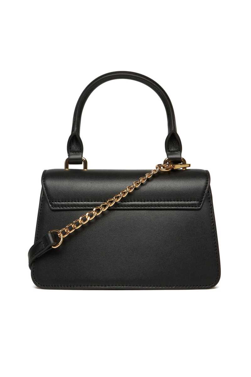 Zarafeti ve ışıltıyı kompakt bir tasarımda buluşturan bu siyah el çantası, özel günlerinizin ve şık kombinlerinizin vazgeçilmezi olacak. Pürüzsüz dokulu yüzeyi, ön kapakta yer alan büyük ve parlak altın rengi metal harf logolarıyla zenginleştirilmiştir. Hem elde taşımak için zarif bir kısa sapa hem de omzunuzda şık bir duruş sergileyen altın rengi zincir askıya sahiptir. Yapısal formu ve kapaklı tasarımıyla eşyalarınızı güvenle taşımanızı sağlayan bu parça, stilinize lüks bir dokunuş katar.