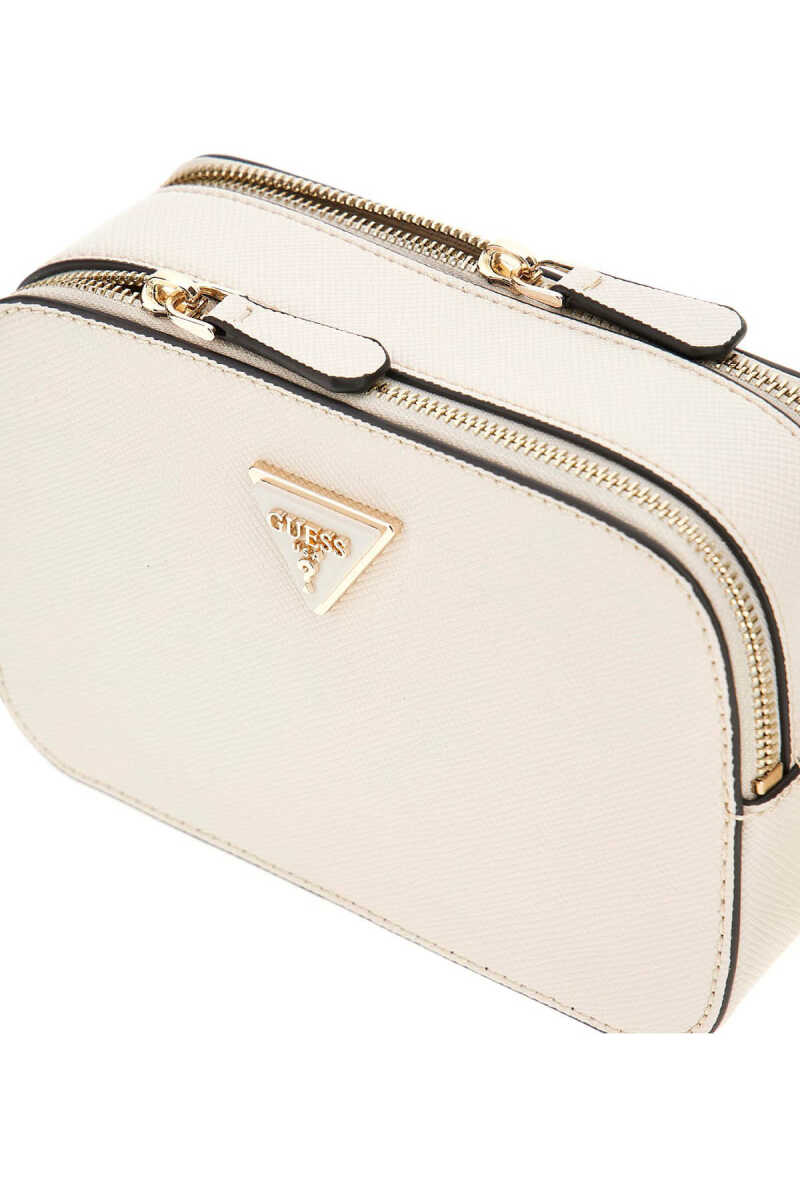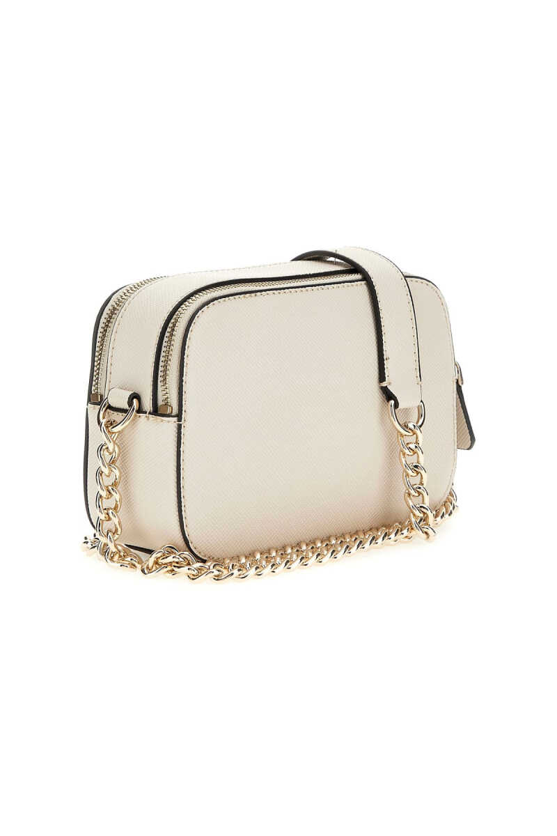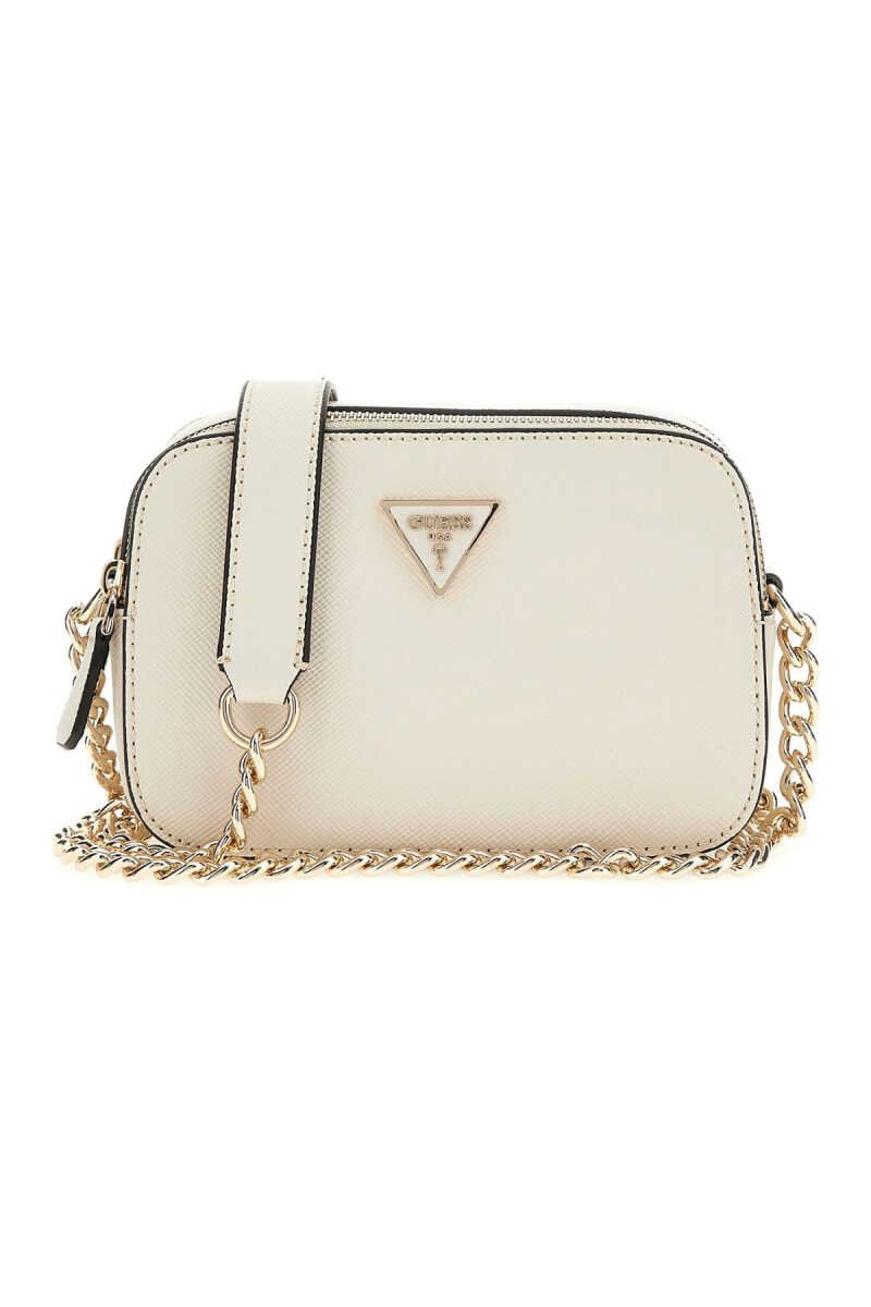 Hem şık hem de son derece fonksiyonel olan bu çapraz askılı çanta, popüler "kamera çantası" silüetine sahiptir. Dokulu poliüretan yüzeyi ve zarif kırık beyaz rengi, parlak altın tonlarındaki metal aksesuarlarla sofistike bir uyum yakalar. İki ayrı fermuarlı ana bölmesi sayesinde eşyalarınızı düzenli ve güvenli bir şekilde saklama imkanı sunar. Ön yüzeydeki üçgen formlu metal logo ve zincir detaylı omuz askısı, çantanın modern tasarımını tamamlar.