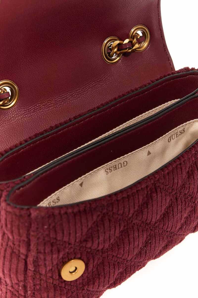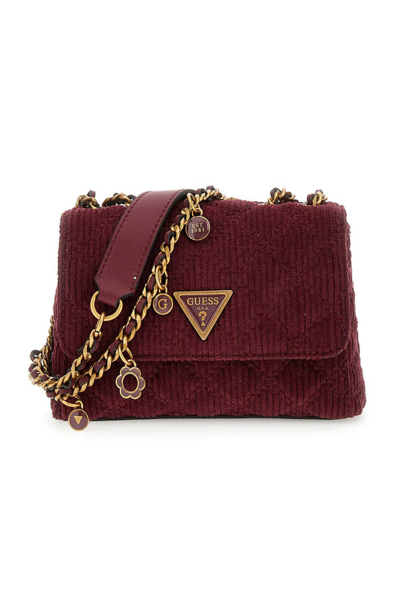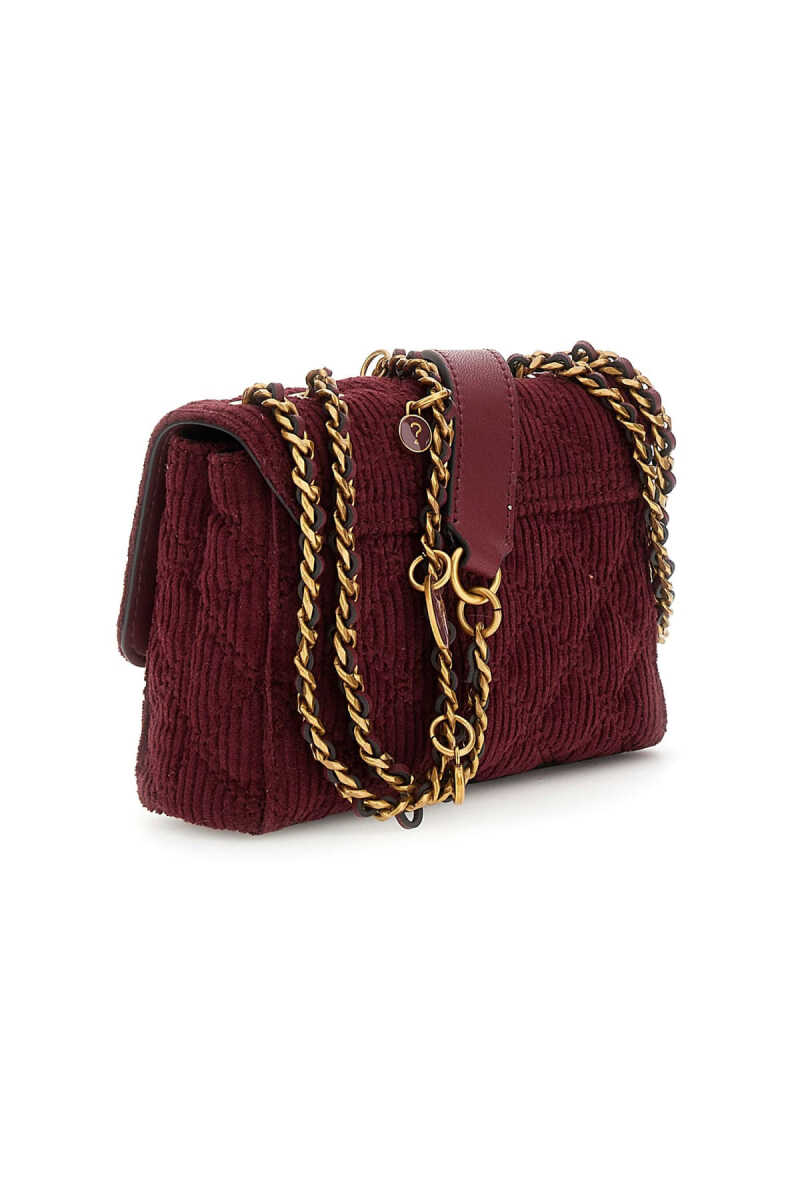 Dokulu ve zengin bir görünüme sahip bu omuz çantası, fitilli kadife kumaşıyla öne çıkar. Kumaş üzerine işlenmiş zarif kapitone dikişler, çantaya derinlik ve sofistike bir karakter kazandırır. Parlak zincir askısı ve askıya takılı dekoratif metal charm'lar, çantanın derin bordo rengiyle modern bir kontrast yaratır. Çoklu bölmeli iç tasarımı fonksiyonel bir kullanım sunarken, ön kapaktaki üçgen formlu metal aksesuar tasarıma imzasını atar.