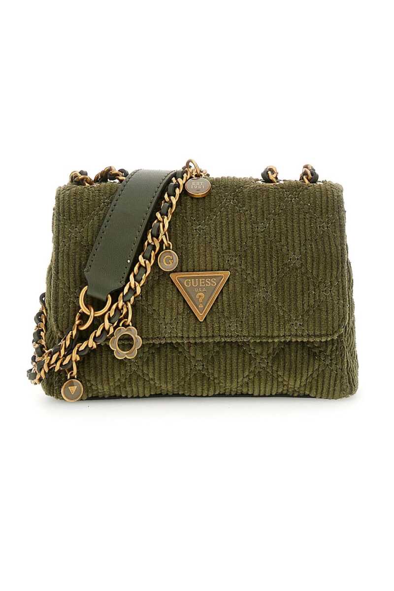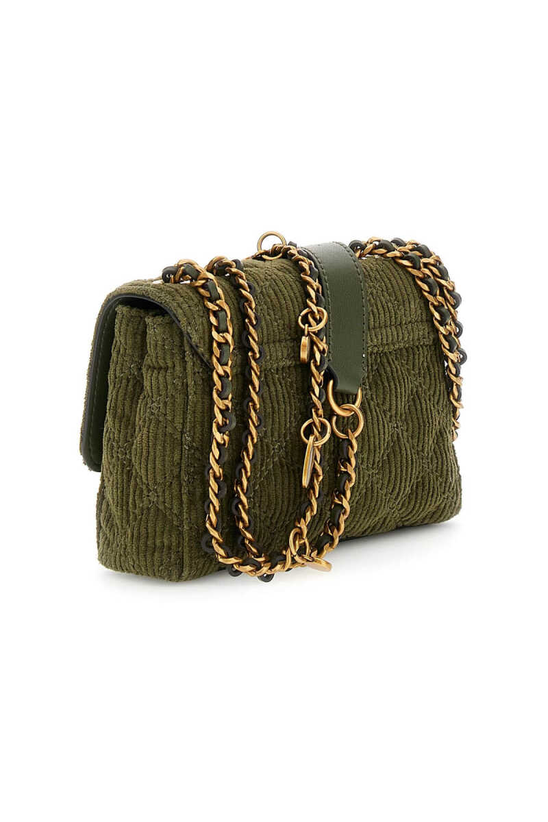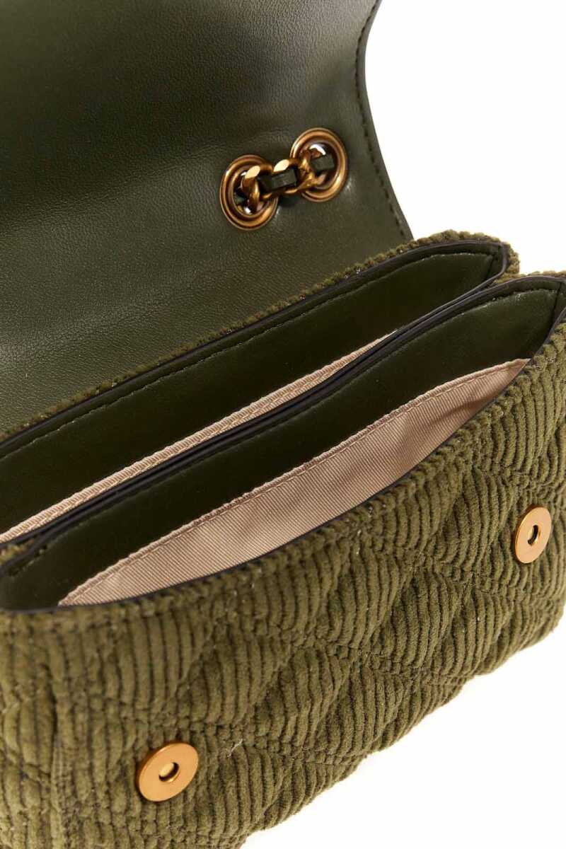 Dokulu ve zengin bir görünüme sahip bu omuz çantası, fitilli kadife kumaşıyla öne çıkar. Kumaş üzerine işlenmiş zarif kapitone dikişler, çantaya derinlik ve sofistike bir karakter kazandırır. Parlak zincir askısı ve askıya takılı dekoratif metal charm'lar, çantanın haki rengiyle modern bir kontrast yaratır. Çoklu bölmeli iç tasarımı fonksiyonel bir kullanım sunarken, ön kapaktaki üçgen formlu metal aksesuar tasarıma imzasını atar.