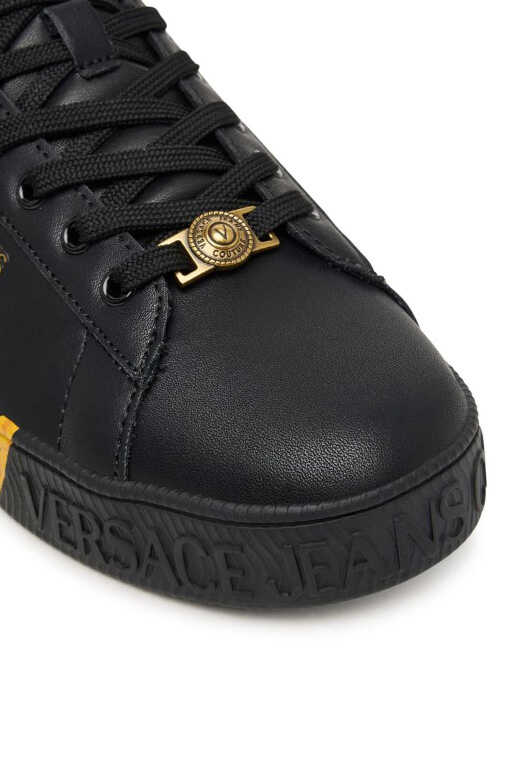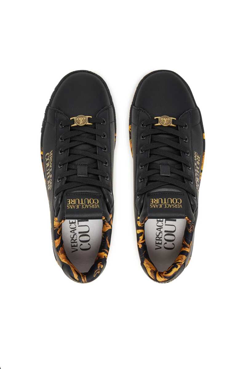Klasik kort ayakkabısı silüetini lüks ve göz alıcı detaylarla yeniden yorumlayan bu sneaker, stilinize iddialı bir dokunuş katacak. Pürüzsüz siyah deri yüzeyi, markanın ikonik altın sarısı barok deseniyle süslenmiş kauçuk tabanı ve iç astarıyla çarpıcı bir kontrast oluşturur. Yan kısmındaki ve dilindeki altın rengi yazı logoları, bağcık üzerindeki metal aksesuarı ve taban kenarındaki kabartma yazısı gibi detaylar, ayakkabıya zengin ve sofistike bir hava katar. Hem konforlu hem de dikkat çekici bu sneaker, günlük kombinlerinize lüks bir imza atmak için mükemmel bir seçimdir.