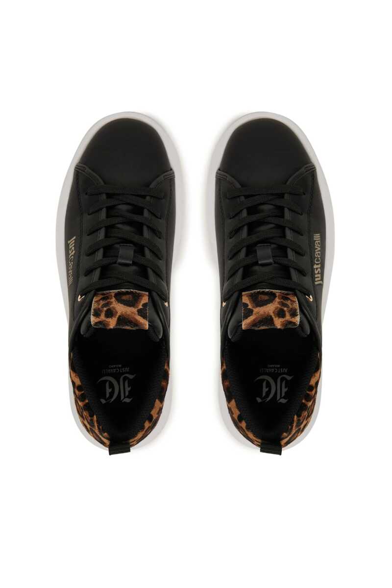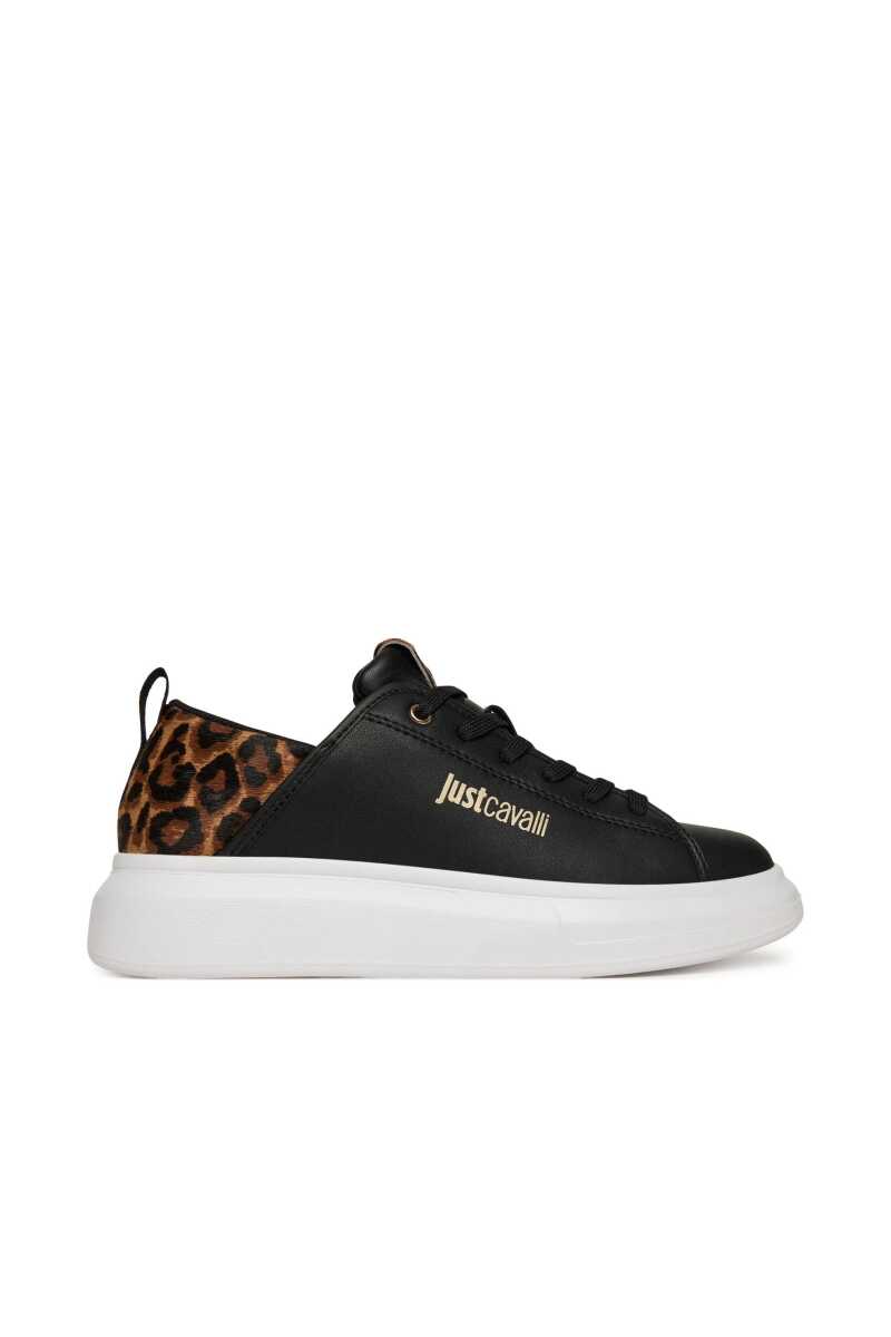 Klasik siyah sneaker silüetine vahşi ve şık bir dokunuş katan bu ayakkabı ile stilinizi bir üst seviyeye taşıyın. Pürüzsüz siyah yüzeyi, dil ve topuk kısmındaki göz alıcı leopar deseniyle cesur bir kontrast oluşturur. Yan kısmındaki altın rengi yazı logosu ve topuktaki dikey logo detayı tasarıma lüks bir imza katarken, kalın beyaz Phylon tabanı hem güncel bir görünüm sunar hem de gün boyu üstün konfor sağlar. Deri ve poliüretan karışımı malzemesiyle kalite vadeden bu bağcıklı sneaker, gardırobunuzdaki her parçayla zahmetsizce uyum sağlayarak stil sahibi duruşunuzu tamamlayacak.