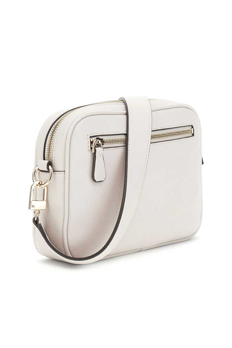 Günlük kullanım için ideal olan bu çapraz askılı çanta, minimalist ve fonksiyonel "kamera çantası" tasarımıyla öne çıkar. Dokulu kırık beyaz yüzeyi ve sade silüeti, çantaya zamansız bir hava katar. Konforlu bir taşıma deneyimi sunan geniş ve ayarlanabilir omuz askısı, çantanın pratikliğini artırır. Ön yüzeydeki üçgen formlu metal aksesuar zarif bir detay sunarken, arka kısmındaki fermuarlı cep ek saklama alanı sağlar.
