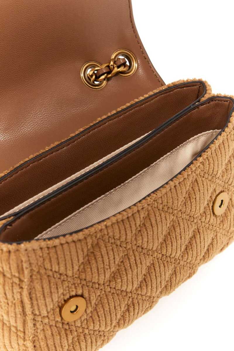 Zengin fitilli dokusu ve şık kapitone deseniyle bu omuz çantası, stilinize retro ve sofistike bir hava katıyor. Pamuk ve viskoz karışımlı kumaşı, çantaya hem yumuşak bir dokunuş hem de göz alıcı bir görünüm kazandırır. Zincir detaylı omuz askısı ve ona eşlik eden sevimli charm'lar, tasarımın özgün karakterini vurgular. İki ana bölmeden oluşan fonksiyonel iç yapısı, eşyalarınızı düzenli tutmanız için idealdir. Ön yüzdeki ikonik üçgen logosu ise çantanın şıklığını tamamlar.