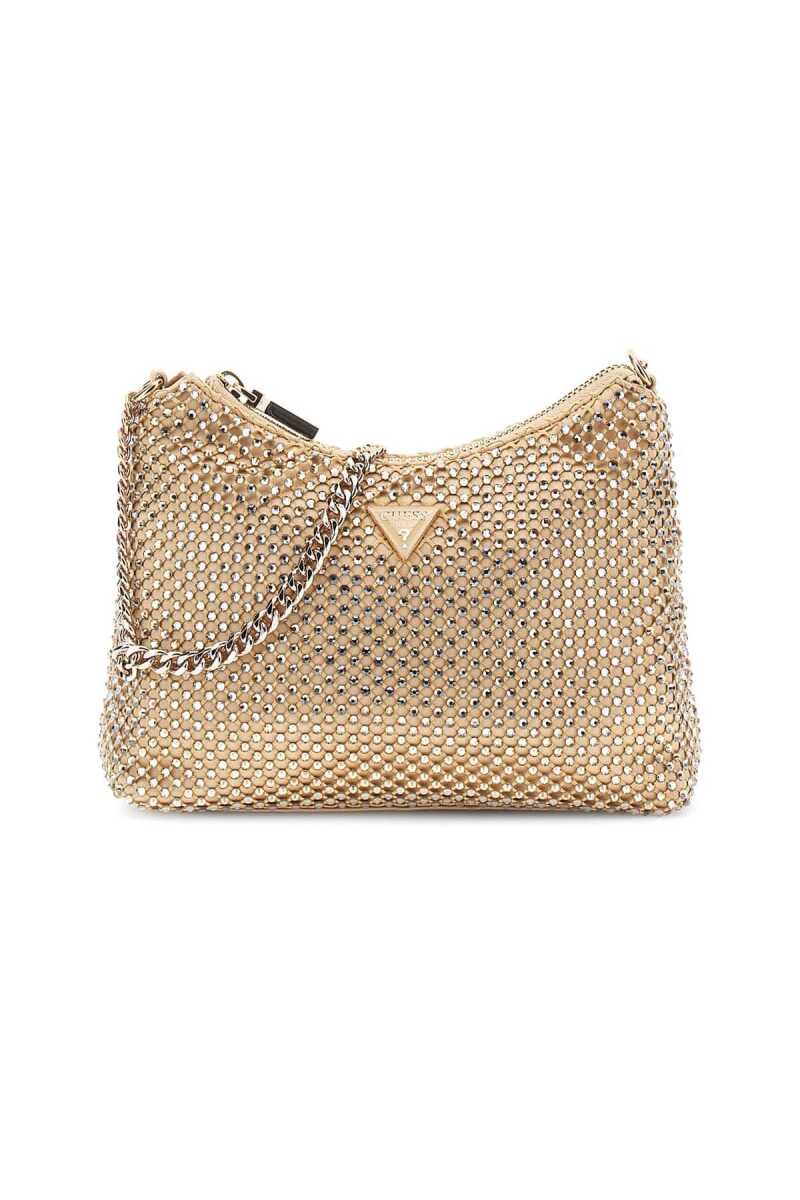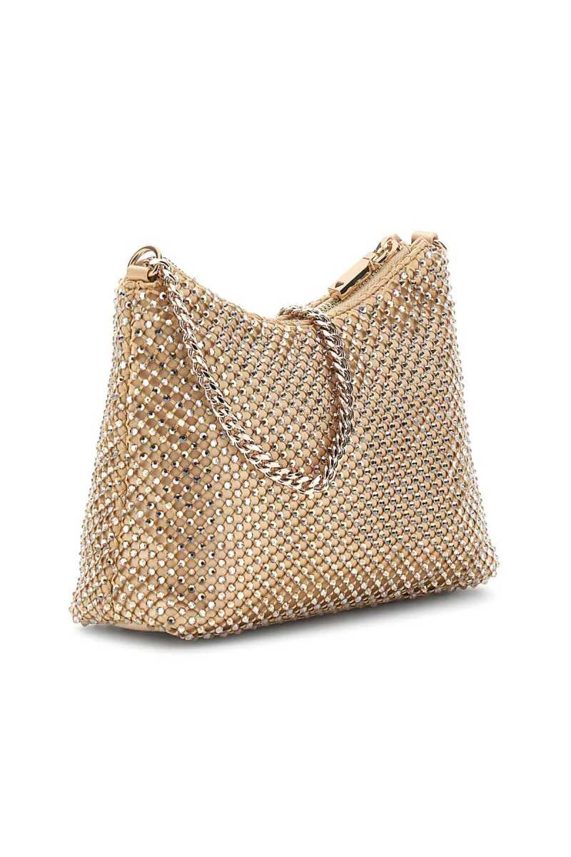 Göz alıcı ve ışıltılı bir tasarıma sahip bu omuz çantası, tüm yüzeyi kaplayan parlak altın rengi metalik örgüsüyle, her hareketinizde ışığı yansıtarak stilinize iddialı bir dokunuş katar. Yumuşak "hobo" formundaki çantanın zincir detaylı omuz askısı, tasarıma lüks bir hava katarken, ön yüzeydeki üçgen formlu metal aksesuar zarif bir imza atar.