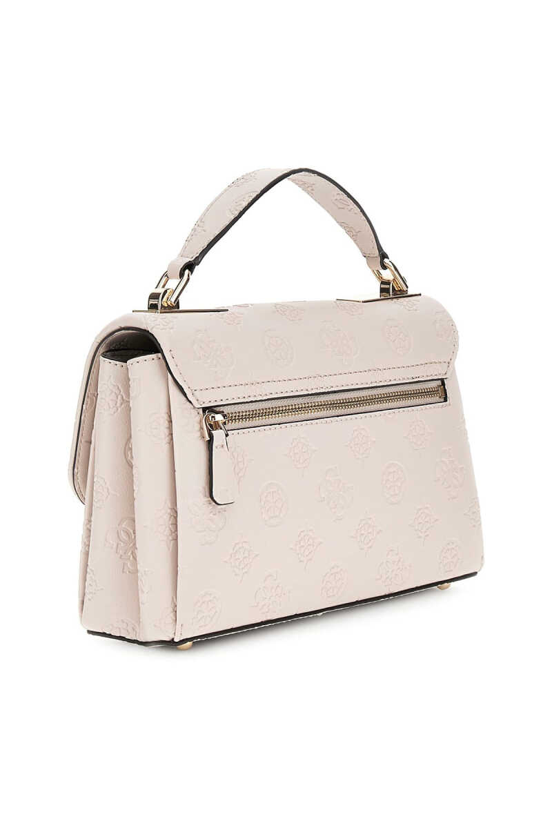 Klasik ve zarif bir silüete sahip bu çanta, tüm yüzeyini kaplayan sofistike kabartma monogram deseni ile öne çıkar. Yapılandırılmış formu ve üstten taşıma sapı, şık bir el çantası görünümü sunar. Ön kapak üzerinde yer alan üçgen formdaki metal aksesuar tasarıma imza atarken, arka yüzeydeki fermuarlı cep pratik bir kullanım sağlar.