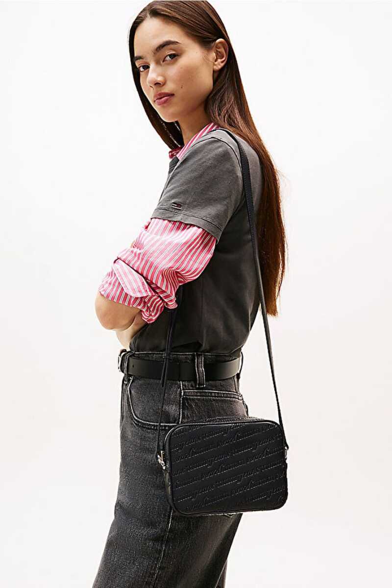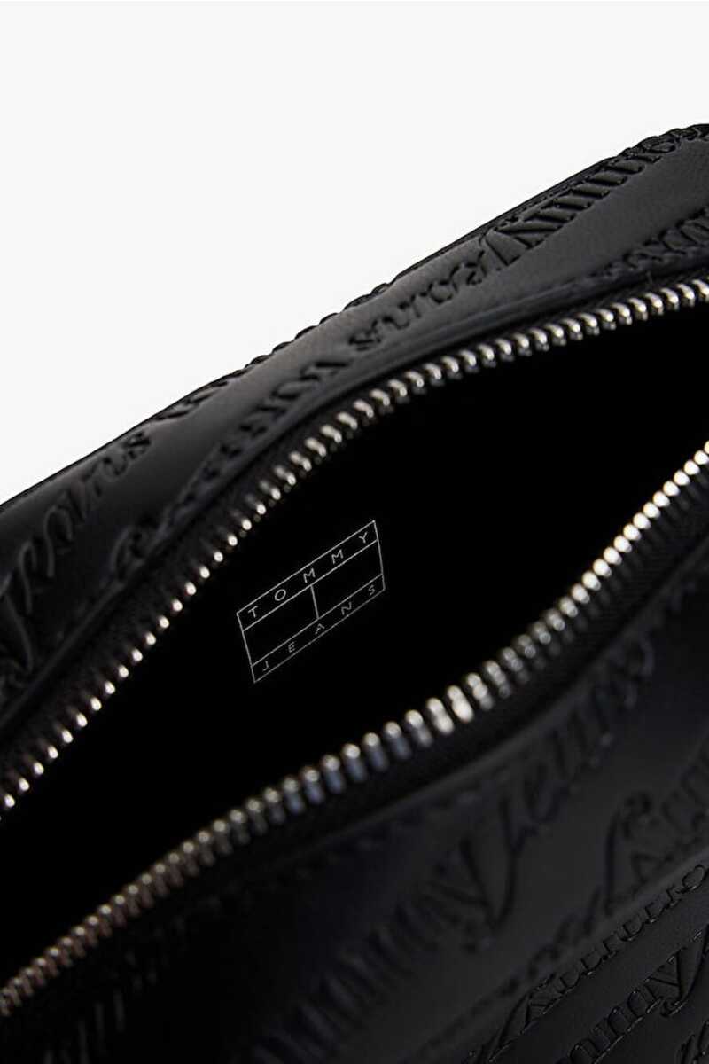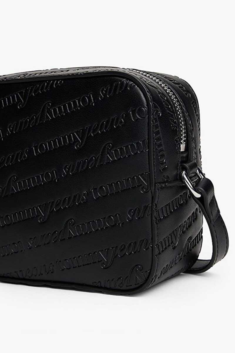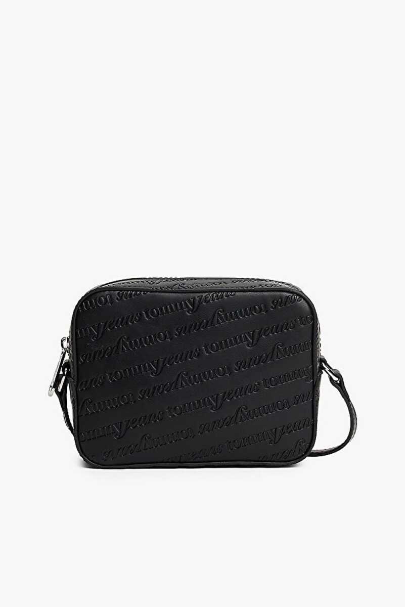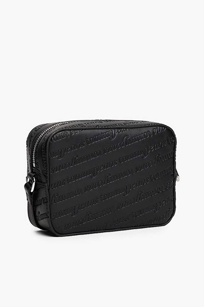Klasik kamera çantasına modern ve çarpıcı bir dokunuş katan bu model, baştan aşağı kabartma yazı deseniyle öne çıkıyor. Dokulu yüzeyi, çantaya sofistike bir görünüm kazandırırken, çok yönlü siyah rengi her stile kolayca uyum sağlar. Fermuarlı ana bölmesi günlük temel eşyalarınız için güvenli bir saklama alanı sunar. Ayarlanabilir çapraz askısı sayesinde konforlu ve kişiselleştirilebilir bir kullanım sağlarken, fermuar ucundaki renkli detay tasarıma ince bir dokunuş katar.