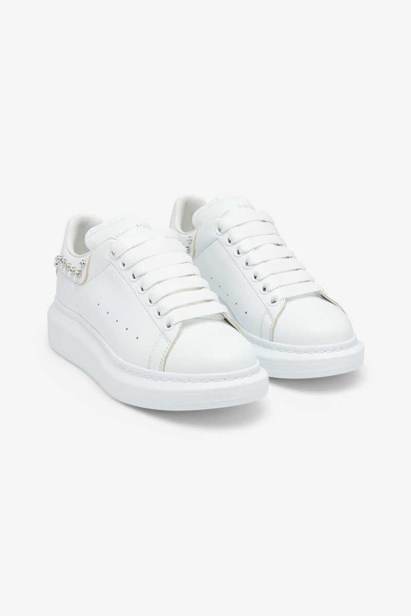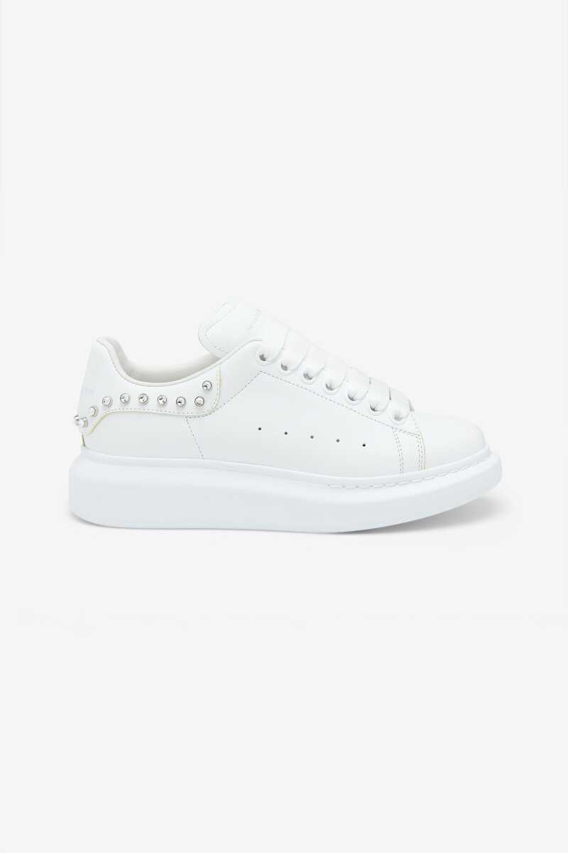 İkonik ve hacimli platform tabanıyla anında tanınan bu sneakers, minimalist lüksü ve modern tasarımı bir araya getiriyor. Üstün kaliteli dana derisinden üretilen pürüzsüz beyaz saya, yan kısımdaki perfore (delikli) detaylarla nefes alabilirlik sunar. Tasarımın en belirgin özelliği, topuk çevresini süsleyen parlak gümüş rengi zımba detaylarıdır. Bu İtalyan yapımı sneakers, imzası niteliğindeki kauçuk tabanıyla her kombine iddialı bir stil katacaktır.