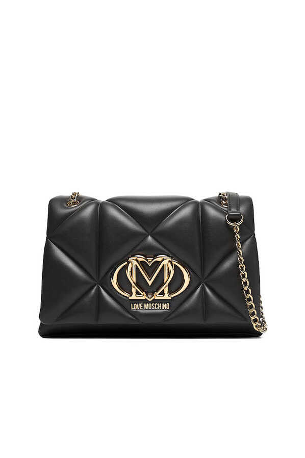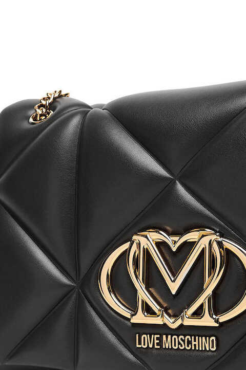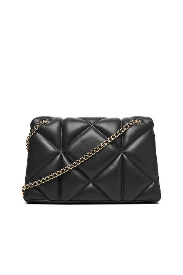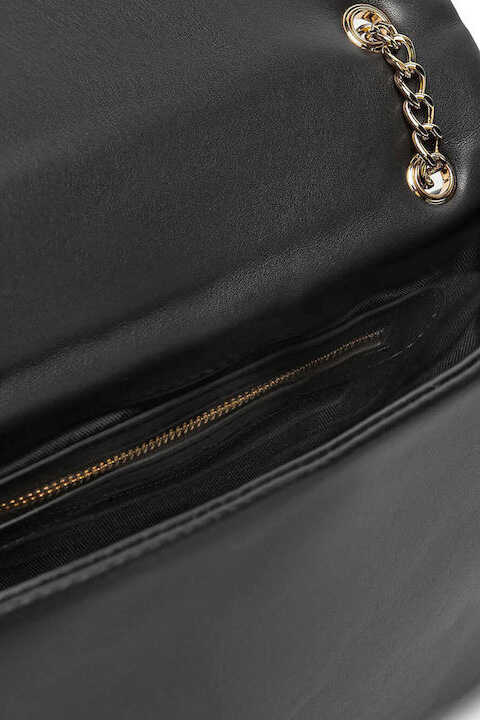 Geometrik kapitone dikişleri ve dolgun yapısıyla dikkat çeken bu omuz çantası, kombinlerinize modern ve lüks bir dokunuş katıyor. Yumuşak dokulu poliüretan siyah yüzeyi, ön kapak üzerinde yer alan büyük ve parlak altın rengi, kalp detaylı metal amblem ile zenginleştirilmiştir. Zincir ve poliüretan karışımlı omuz askısı, hem şık bir görünüm hem de konforlu bir taşıma deneyimi sunar. Kapaklı tasarımı sayesinde eşyalarınızı güvenle taşıyabileceğiniz bu parça, gündüzden geceye geçişte stilinizin tamamlayıcısı olacak.