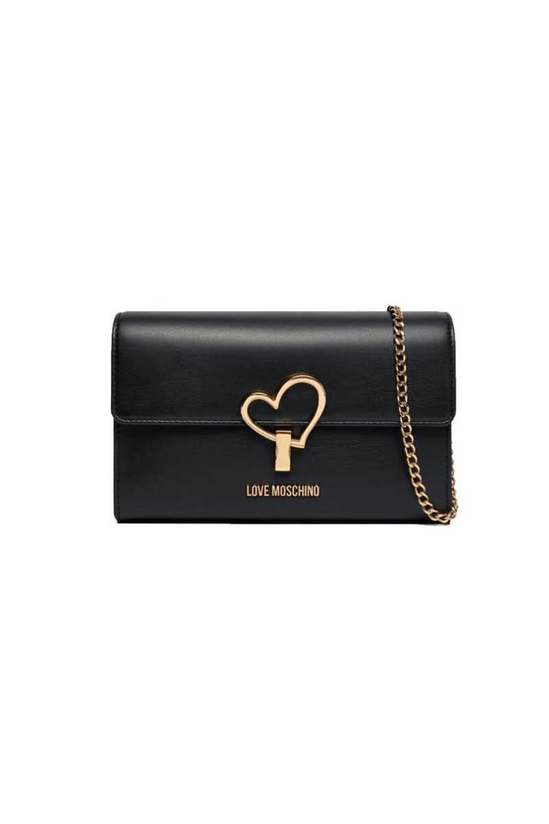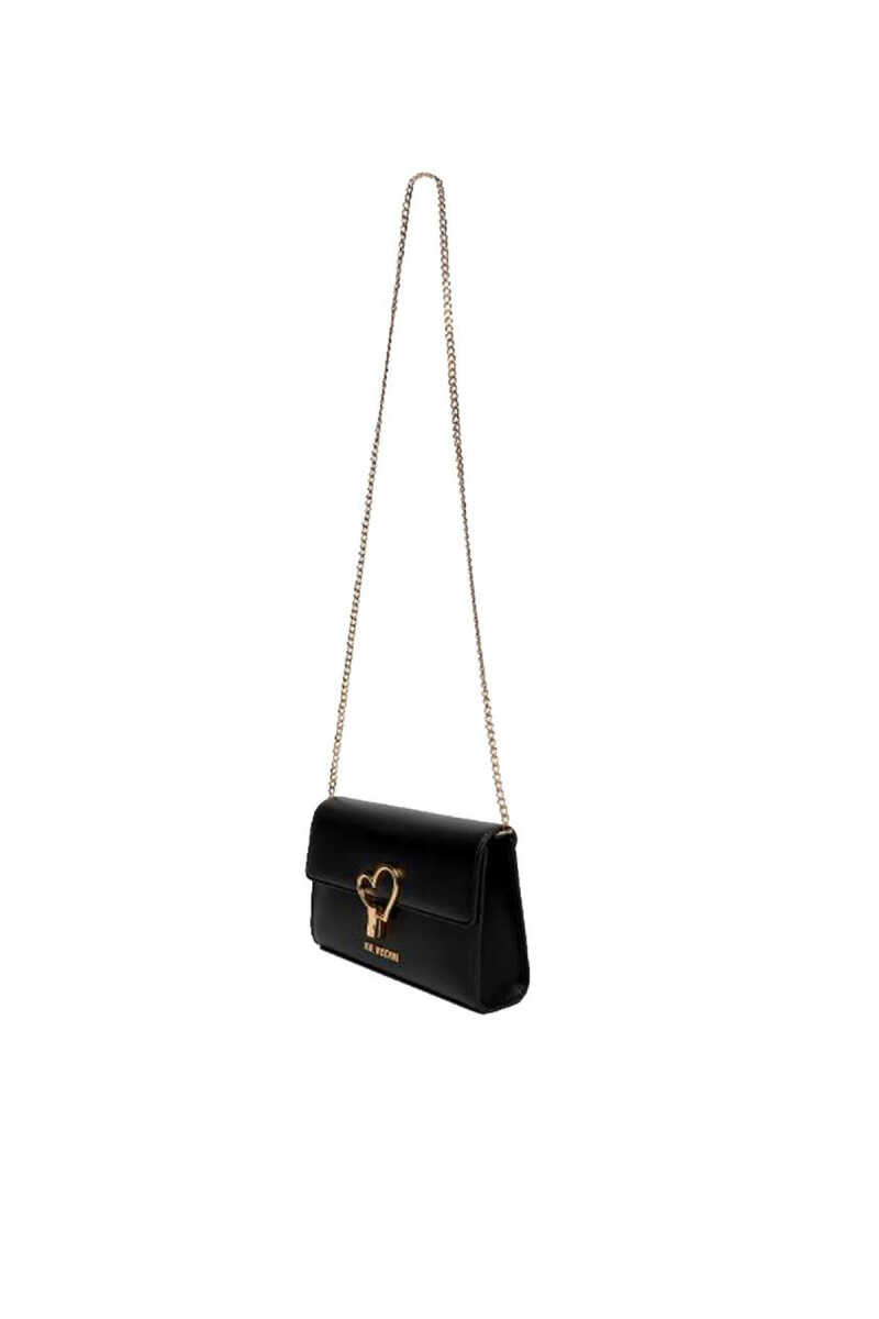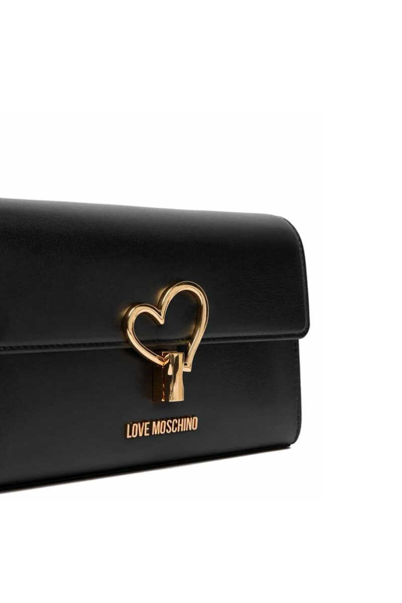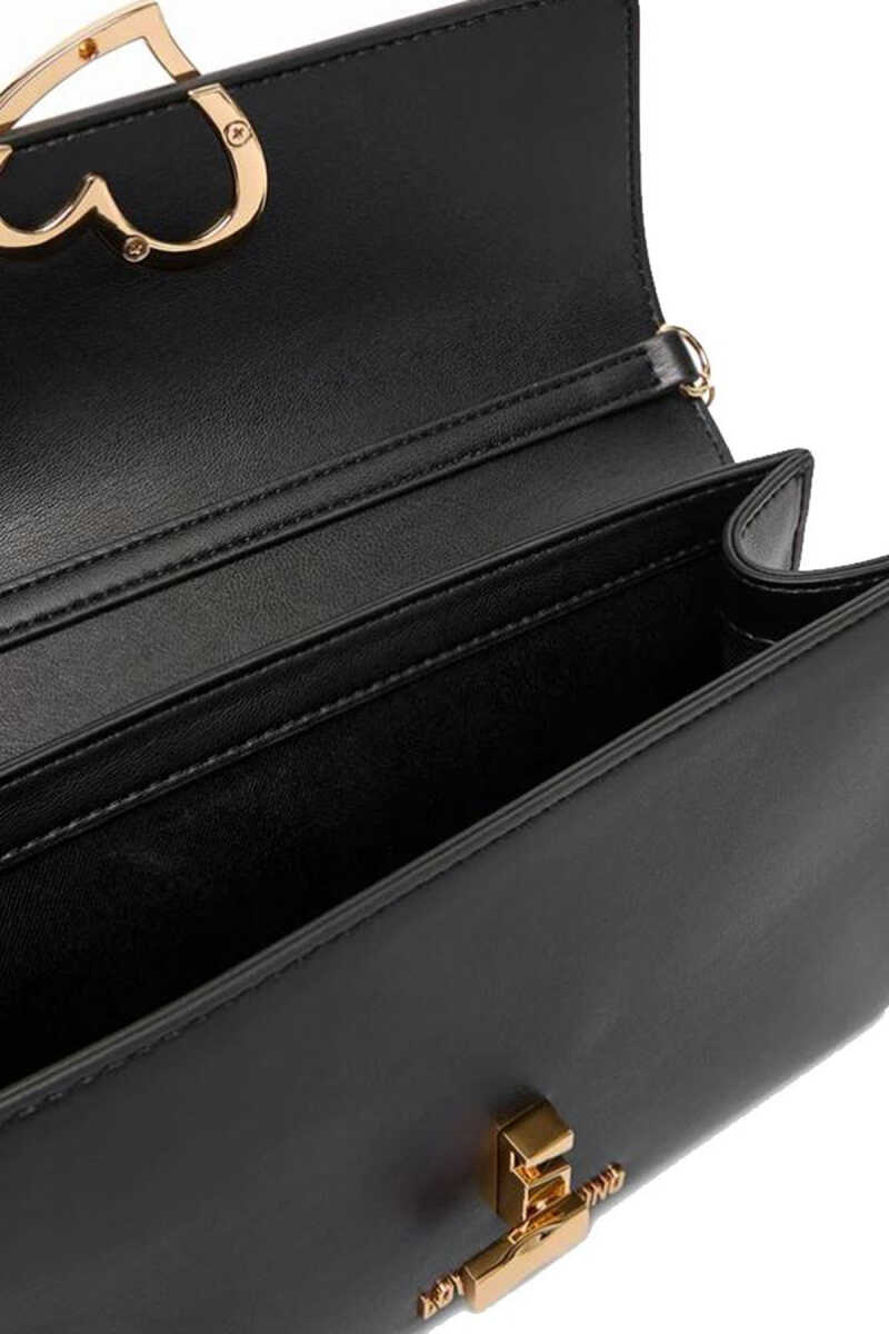 Love Moschino’nun siyah omuz çantası, ön kapakta yer alan gold kalp formundaki toka detayıyla dikkat çeker.