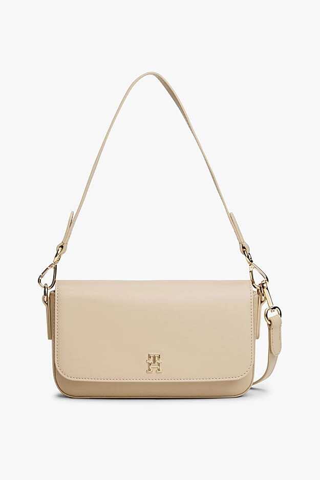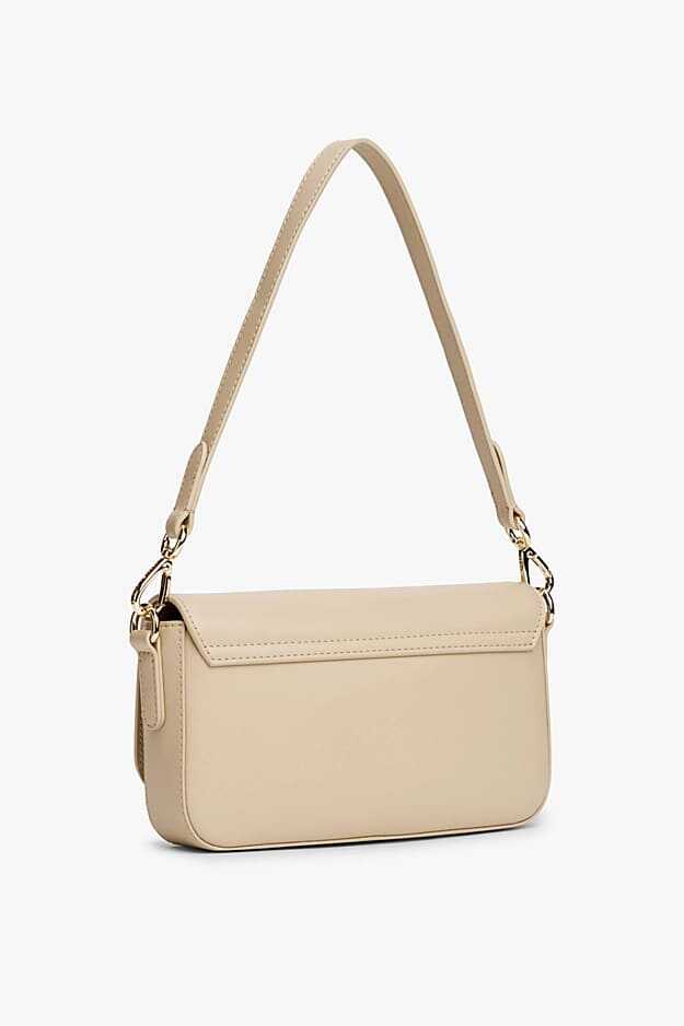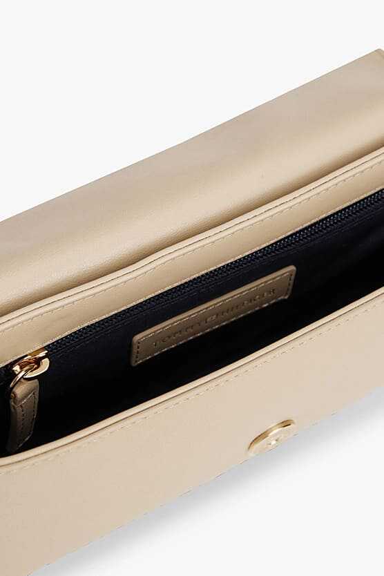 Her gardırop için olmazsa olmaz, şık ve son derece uyarlanabilir bir aksesuar. Ayarlanabilir ve tamamen çıkarılabilir askısı sayesinde bu çok yönlü model, gündüzleri pratik bir çapraz askılı çanta, akşamları ise zarif bir portföy (clutch) çantaya dönüşebilir. Pürüzsüz poliüretan malzemesi ve zamansız bej rengi, mıknatıslı kapağı ve üzerindeki parlak metal monogram amblemi ile sofistike bir görünüm sunar. Ana bölme içerisindeki fermuarlı iç cep, küçük ve değerli eşyalarınızı güvenle saklamanız için idealdir.