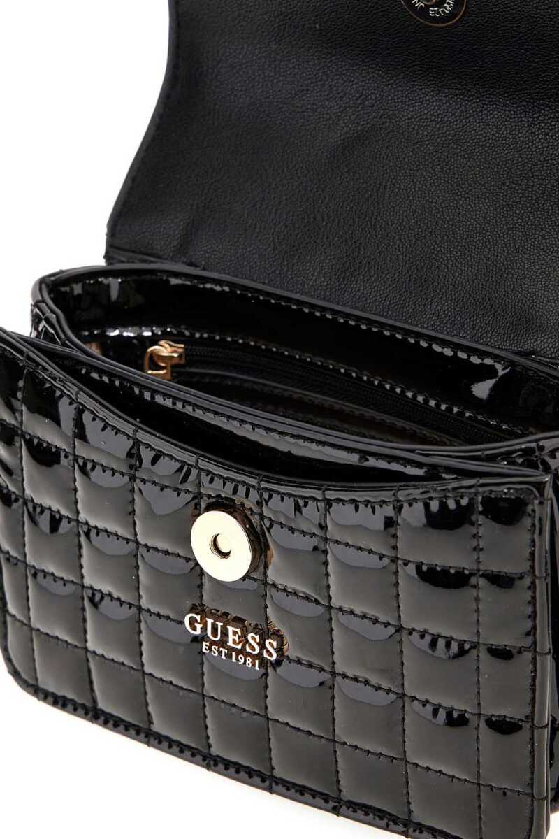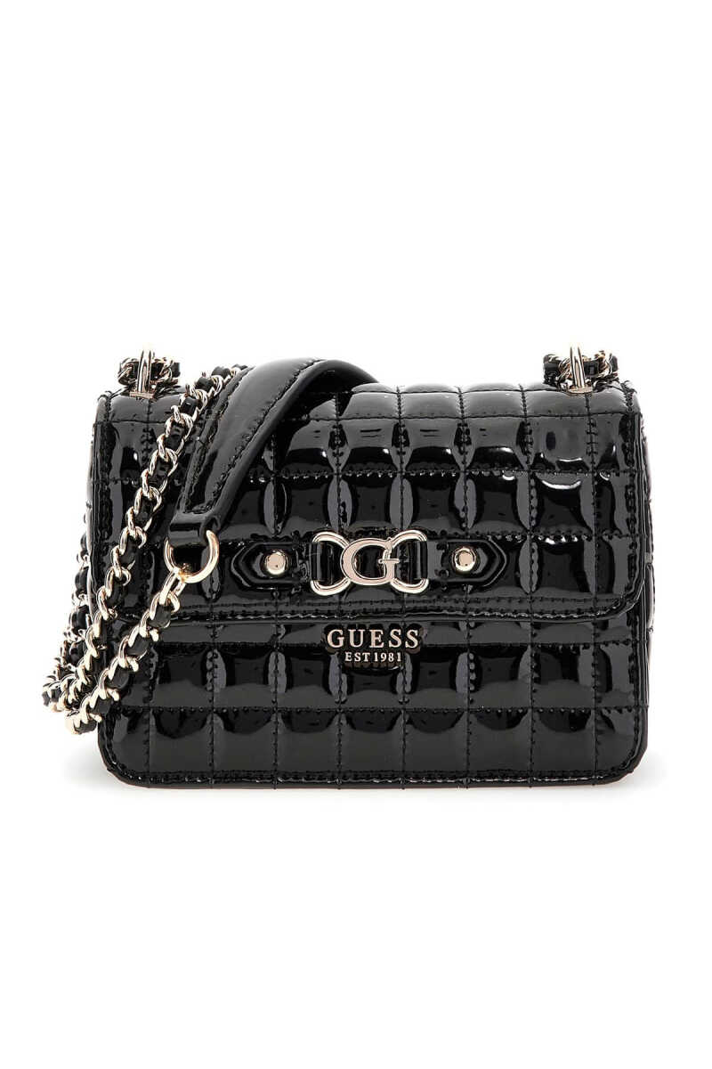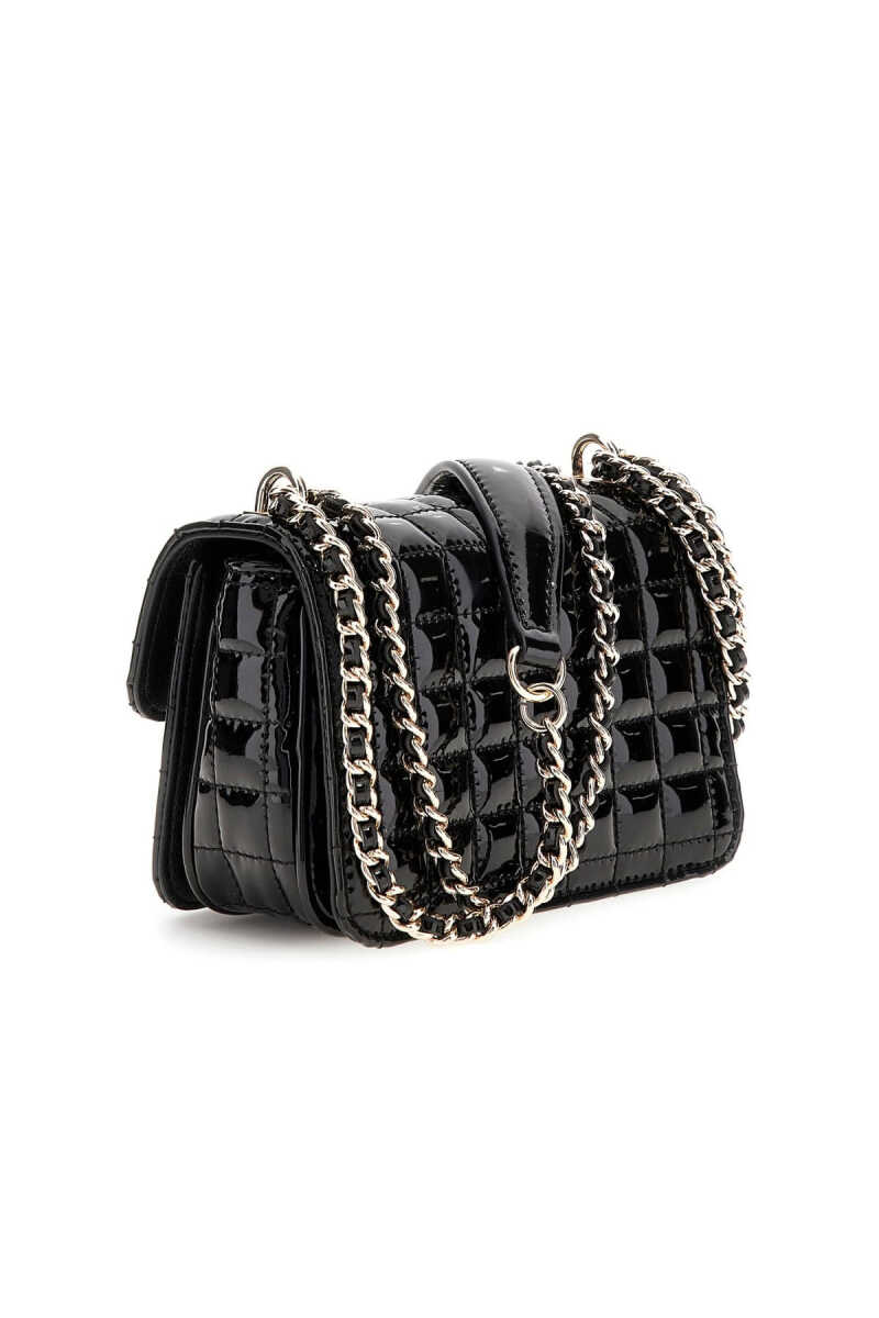 Klasik ve şık bir tasarıma sahip bu omuz çantası, parlak rugan görünümlü yüzeyi ve tüm gövdeyi saran kapitone dikişleriyle dikkat çeker. Ön yüzeyde yer alan birbirine geçmiş halka formundaki metal aksesuar ve minimalist yazı baskısı, çantanın zarif tasarımını tamamlar. Ayarlanabilir zincir askısı sayesinde hem omuzda hem de çapraz olarak kullanılabilen model, şıklığı ve fonksiyonelliği bir araya getirir.
