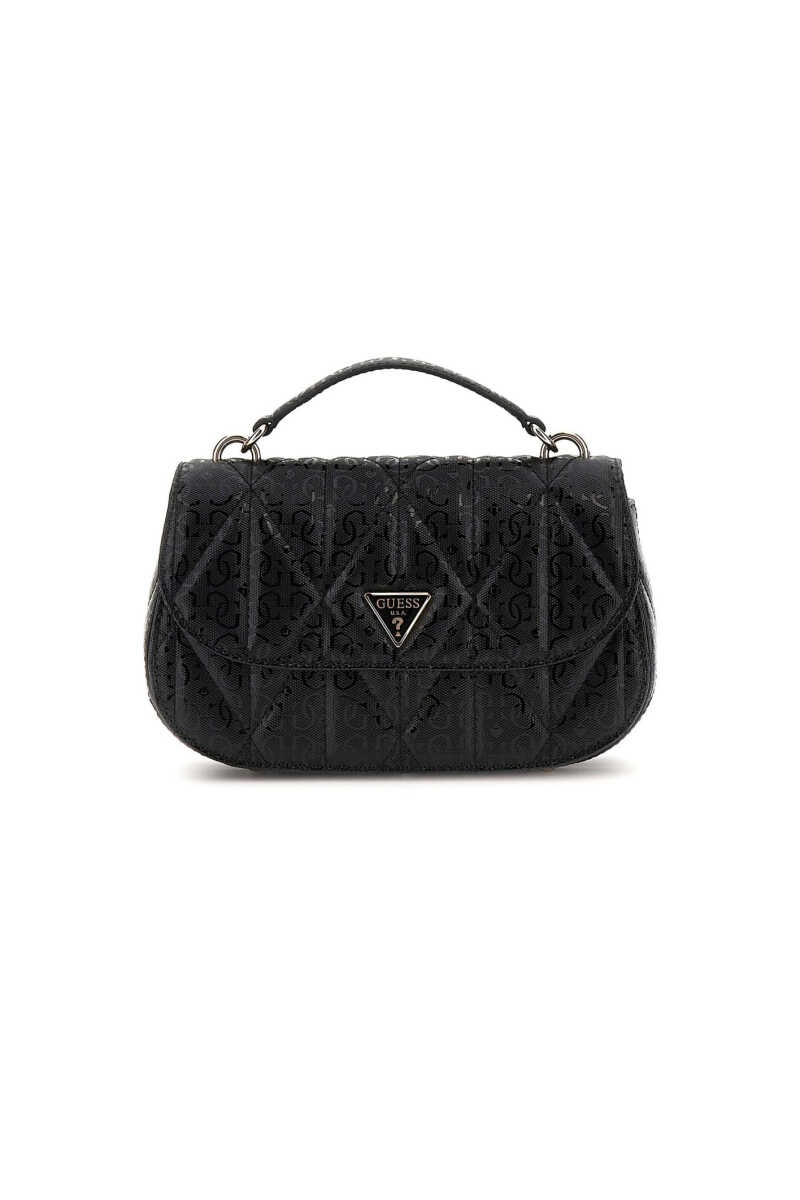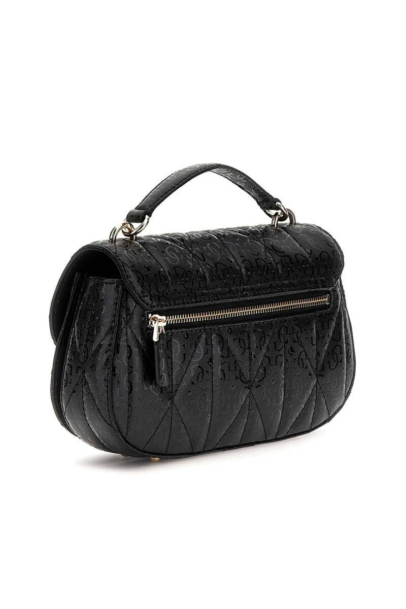 Zarif ve yapısal bir tasarıma sahip bu çanta, parlak rugan görünümlü yüzeyiyle dikkat çeker. Gövdeyi süsleyen kapitone dikişler ve kabartma monogram deseni, çantaya özgün ve sofistike bir doku kazandırır. Şık üstten taşıma sapı, klasik bir el çantası görünümü sunarken, arka yüzeyindeki fermuarlı cep pratiklik katar. Ön kapaktaki üçgen formlu metal aksesuar ise tasarımı tamamlayan modern bir detaydır.