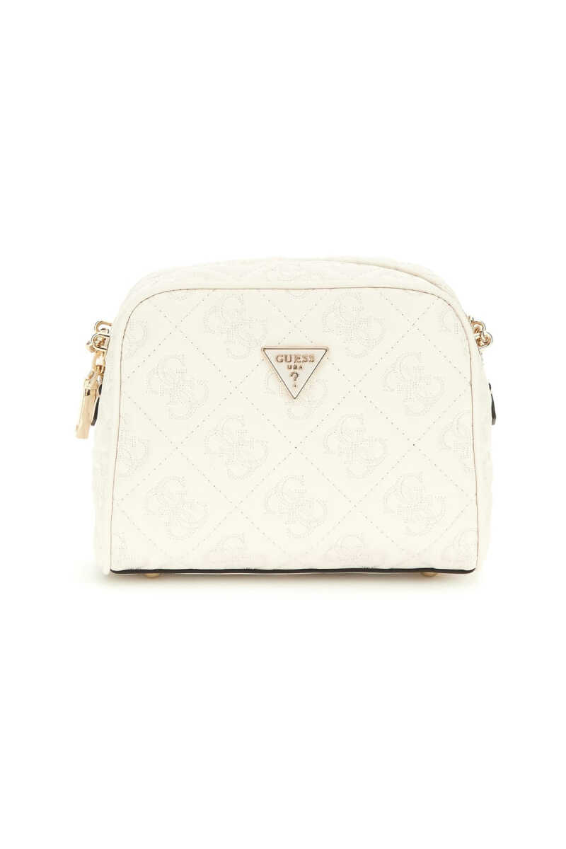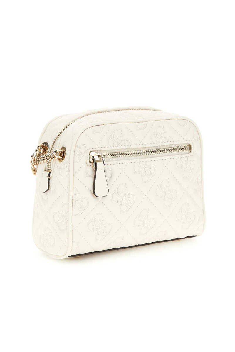 Hem şık hem de pratik bir tasarıma sahip olan bu çapraz askılı çanta, popüler "kamera çantası" formundadır. Kırık beyaz rengi yüzeyi, kapitone dikişler ve içerisine işlenmiş kabartma monogram deseni ile zenginleştirilerek özgün bir doku sunar. Ön yüzeydeki üçgen formlu metal aksesuar, çantanın zarif tasarımını tamamlarken, arka kısmındaki fermuarlı cep ek saklama alanı sağlar.