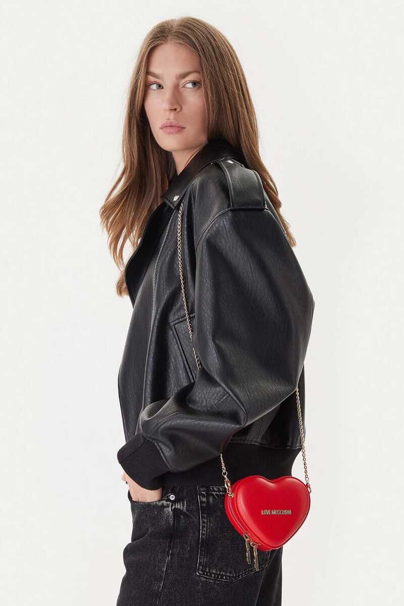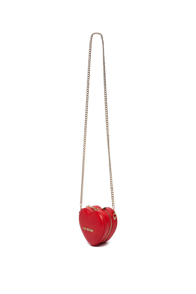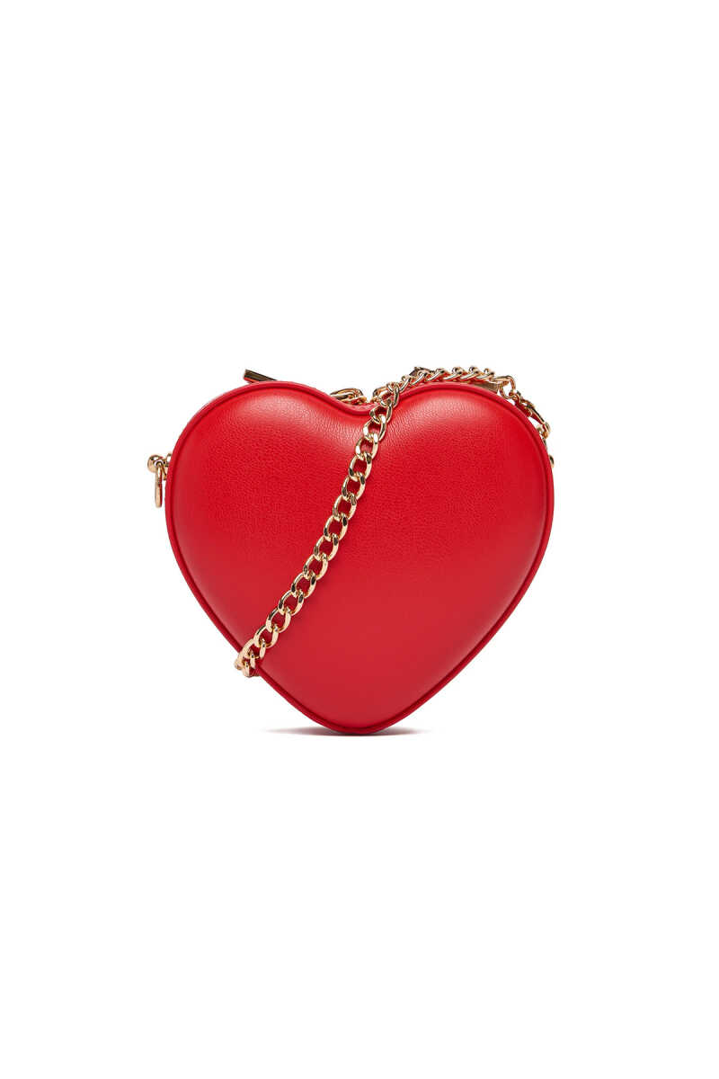 Love Moschino’nun ikonik kırmızı kalp formuna sahip mini omuz çantası, gold zincir askı detayıyla modern ve dikkat çekici bir görünüm sunar.