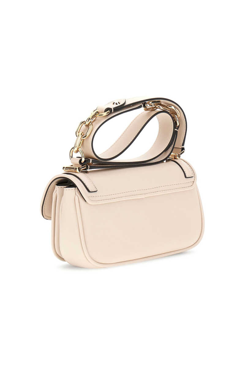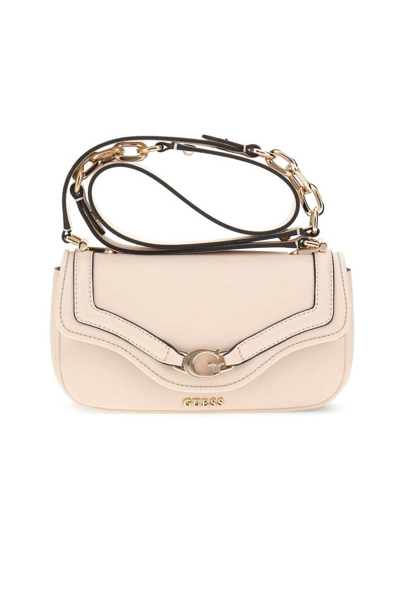 Modern ve şık "baget" formundaki bu omuz çantası, zarif ve minimalist bir stil sunar. Kırık beyaz rengindeki pürüzsüz yüzeyi, çantanın kapak kenarlarını çevreleyen kontrast siyah biye detayıyla çarpıcı bir görünüm kazanır. Ön kapak üzerinde yer alan parlak metal harf logosu ve zincir detaylı omuz askısı, tasarıma modern bir dokunuş katar.