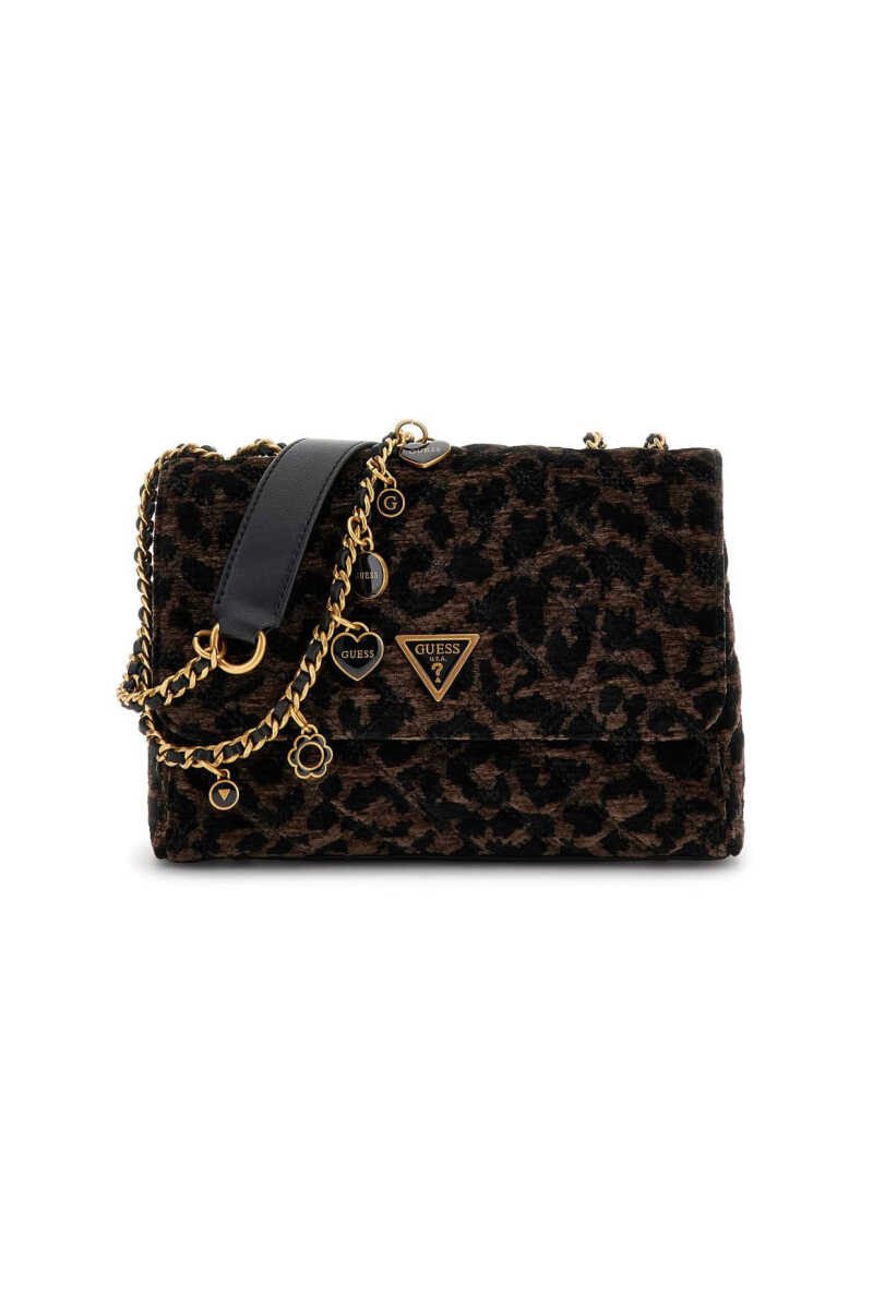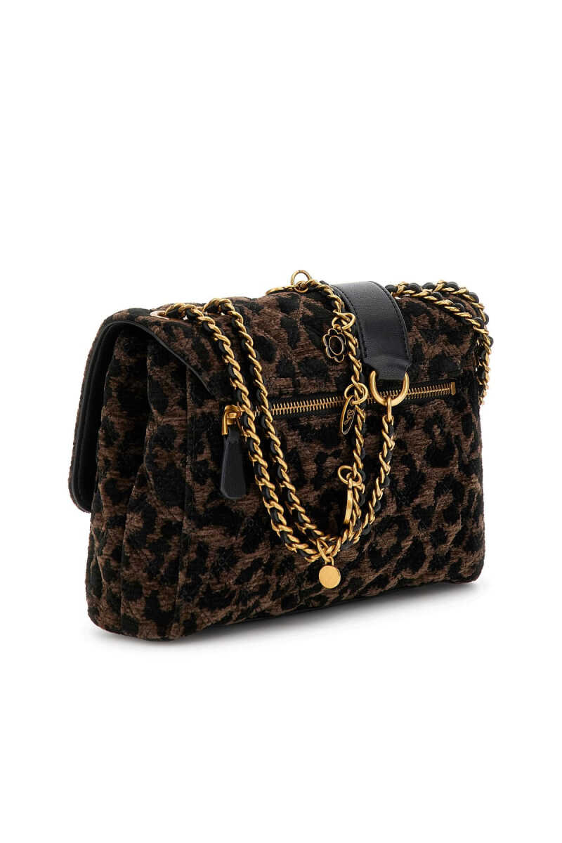 Zengin dokulu jakarlı kumaşı ve göz alıcı leopar deseniyle bu omuz çantası, stilinize iddialı bir karakter katar. Parlak zincir askısı, çantanın dokulu yüzeyi ve siyah renkli poliüretan detaylarıyla sofistike bir uyum içindedir. Askıya takılı dekoratif metal charm'lar tasarıma eğlenceli bir hareket katarken, ön kapaktaki üçgen formlu metal aksesuar şık bir son dokunuş yapar. Arka kısmındaki fermuarlı cep, pratik bir kullanım sunar.