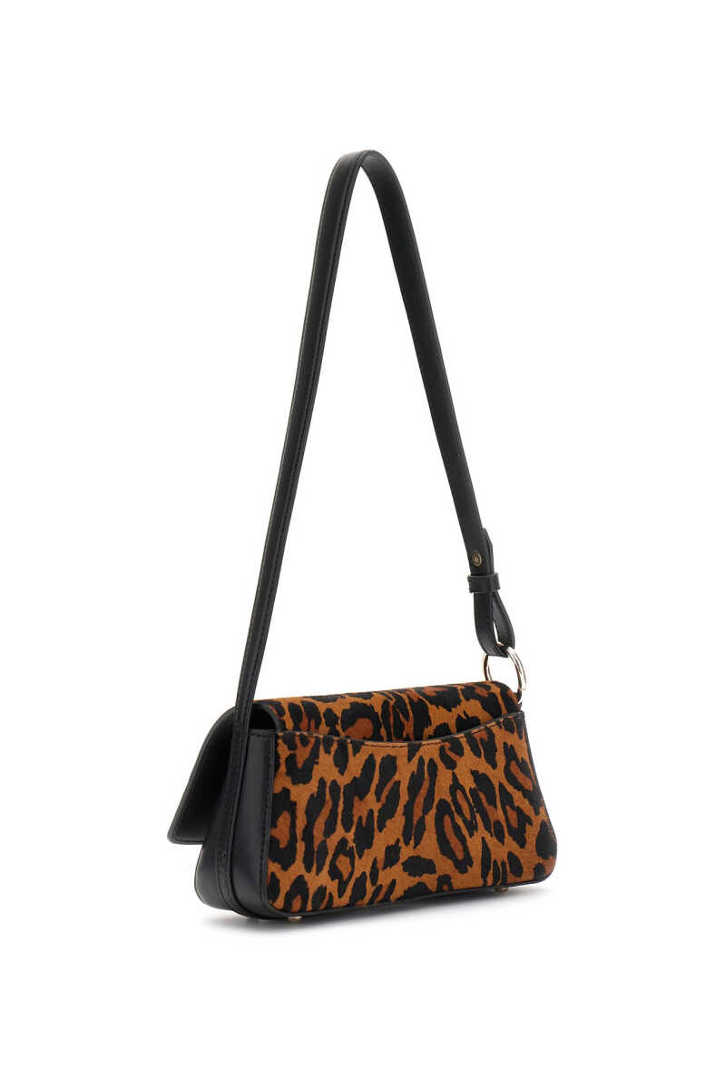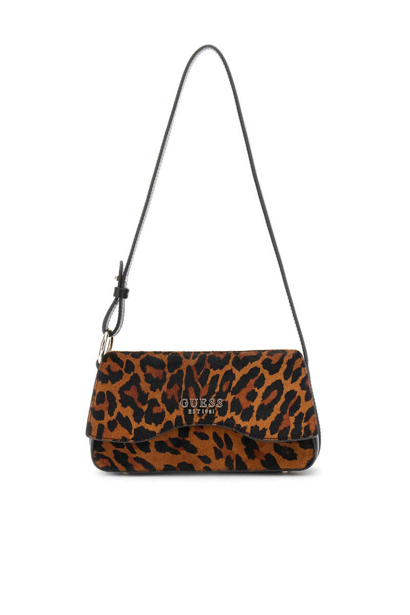 %100 gerçek inek derisinden üretilen bu omuz çantası, göz alıcı stiliyle öne çıkar. Tüy dokulu yüzey üzerindeki canlı leopar deseni, çantanın yanlarındaki ve askısındaki siyah deri detaylarla şık bir kontrast oluşturur. Ön yüzeyde yer alan minimalist yazı baskısı tasarıma modern bir dokunuş katarken, kompakt ve zarif "baget" formu hem gündüz hem de gece kombinleri için ideal bir tamamlayıcıdır.
