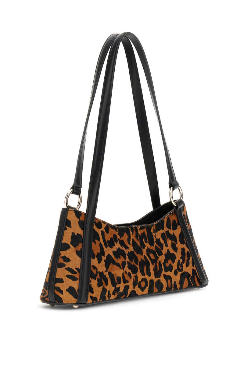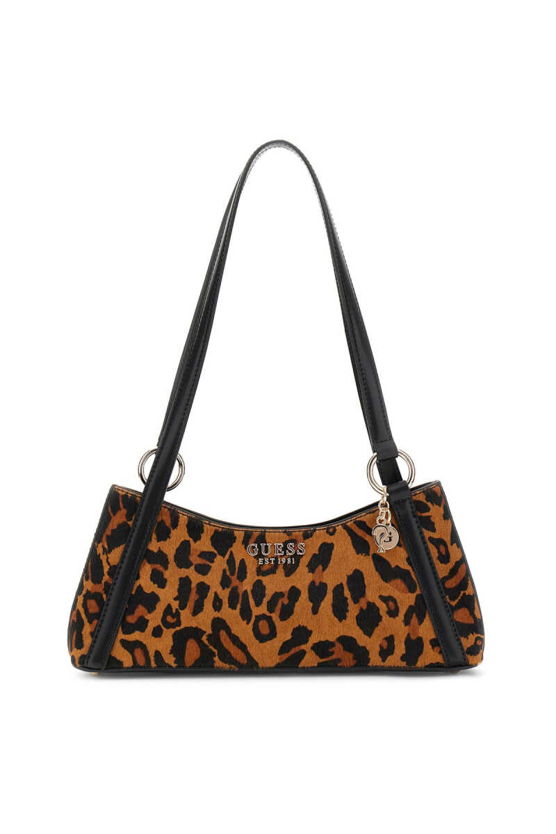 Göz alıcı ve lüks bir tasarıma sahip bu omuz çantası, %100 gerçek inek derisinden üretilmiştir. Tüy dokulu yüzey üzerindeki canlı leopar deseni, çantanın yapısal "baget" formuyla modern bir görünüm sunar. Siyah renkli zarif çift omuz askısı, çantanın şık silüetini tamamlarken, ön yüzdeki minimalist yazı baskısı tasarıma sofistike bir dokunuş katar. Askıdaki küçük metal kalp charm, şık bir detay olarak öne çıkar.
