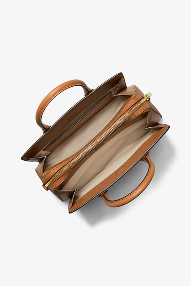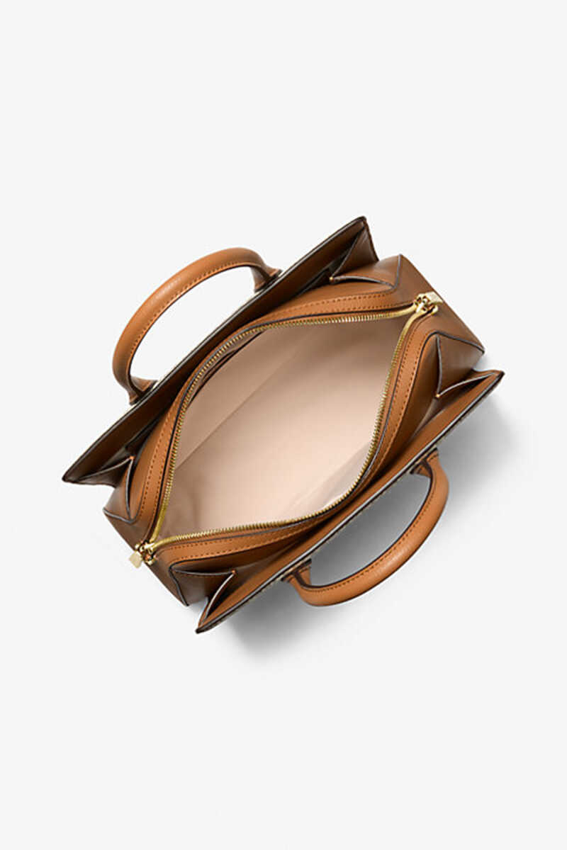 Michael Kors'un Md Satchel modeli, markanın ikonik krem monogram desenini şık taba rengi detaylarla birleştiriyor. Bu yapılandırılmış el çantası, hem zarif çift el sapları hem de çıkarılabilir ayarlanabilir omuz askısı ile çok yönlü kullanım sunar. Geniş iç hacmi ve fermuarlı orta bölmesi, günlük eşyalarınızı düzenli bir şekilde saklamak için idealdir. Parlak altın rengi MK logosu ve metal aksesuarlar, çantanın lüks görünümünü tamamlar.