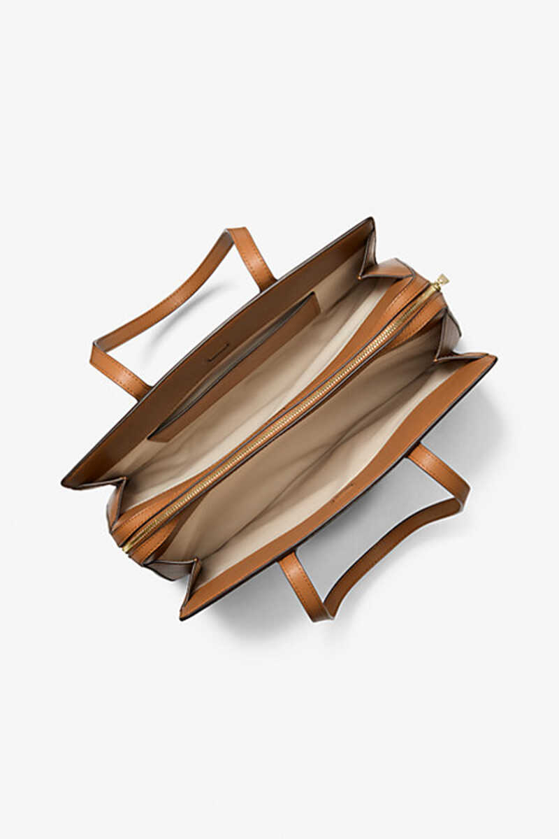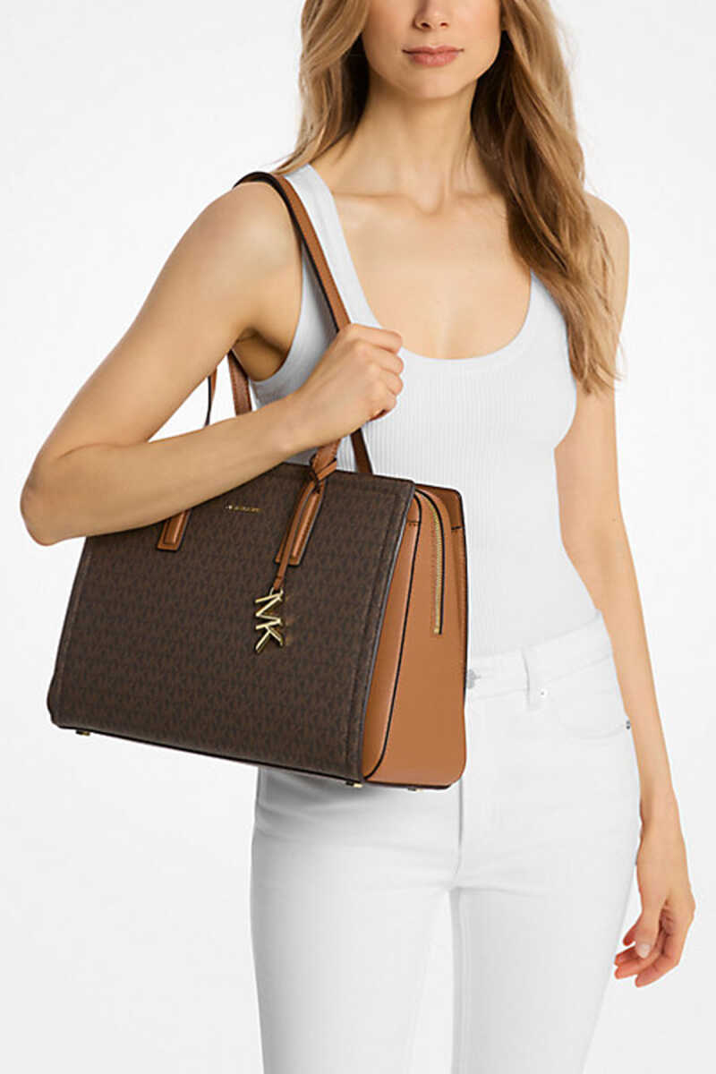 Michael Kors'un Md Tote modeli, markanın ikonik kahverengi monogram desenini ve taba rengi pürüzsüz detayları bir araya getiriyor. Geniş iç hacmi ve tam fermuarlı üst kapaması, bu çantayı günlük kullanım için son derece fonksiyonel ve güvenli bir seçenek haline getirir. 25 cm'lik omuz askıları rahat bir taşıma sunarken, parlak altın rengi MK logo charm'ı tasarıma lüks ve tanınır bir imza atar.