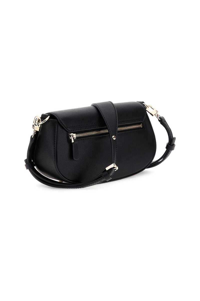 Modern ve şık bir "saddle" formuna sahip bu omuz çantası, günlük stilinize zarif bir dokunuş katar. Pürüzsüz siyah yüzeyi ve ön yüzdeki parlak metal halka detayları, sofistike bir bütünlük oluşturur. Ayarlanabilir omuz askısı kişiselleştirilmiş bir konfor sunarken, arka kısmındaki fermuarlı cep, sık kullandığınız eşyalarınız için pratik bir erişim sağlar.