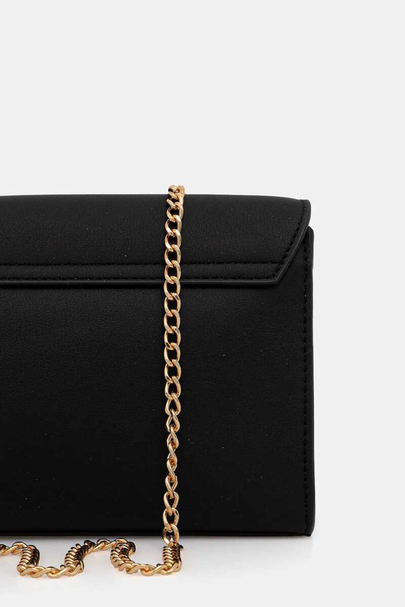 Modern ve minimalist tasarımıyla dikkat çeken bu siyah omuz çantası, şıklığı pratiklikle buluşturuyor. Pürüzsüz dokulu yüzeyi, ön kapak üzerinde yer alan büyük ve parlak altın rengi metal harf detaylarıyla hareketlendirilerek iddialı bir görünüm kazanmıştır. Zarif altın rengi zincir askısı, çantayı hem omuzda hem de çapraz olarak kullanmanıza olanak tanır. Kompakt yapısı ve kapaklı tasarımıyla, telefon, cüzdan gibi temel ihtiyaçlarınızı şık bir şekilde taşımanız için idealdir.