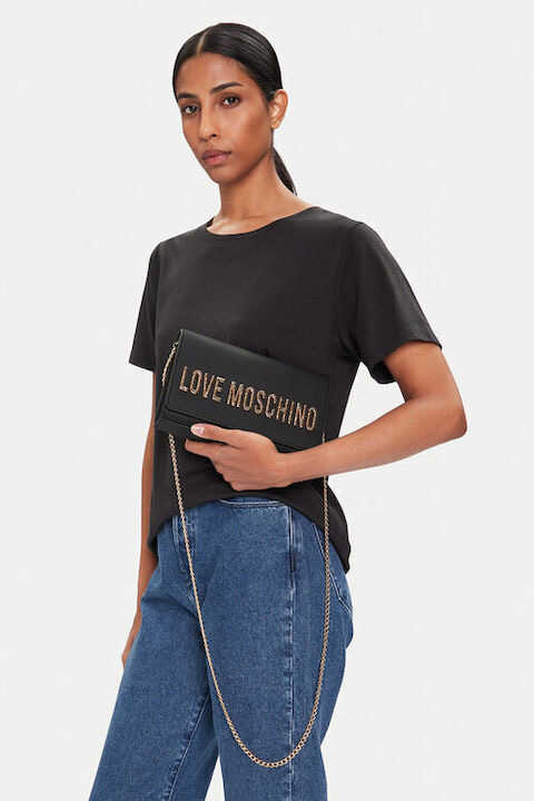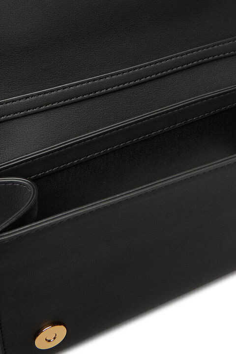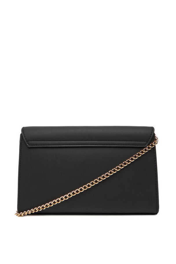 Zarafeti ve modern şıklığı bir araya getiren bu omuz çantası, siyahın asaletini altın rengi detaylarla buluşturuyor. Pürüzsüz dokulu yüzeyi, ön kapak üzerinde yer alan büyük ve kendinden desenli metal harf detaylarıyla zenginleştirilerek göz alıcı bir görünüm kazanmıştır. Zarif zincir askısı, çantayı omzunuzda veya çapraz olarak taşımanıza olanak tanır. Kompakt ve ince yapısıyla, özel davetlerden akşam yemeklerine kadar stilinizin en şık tamamlayıcısı olacak.