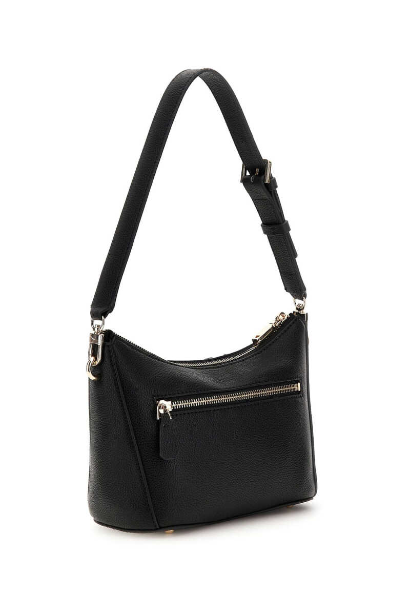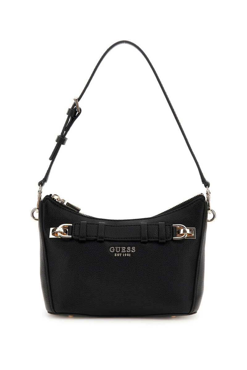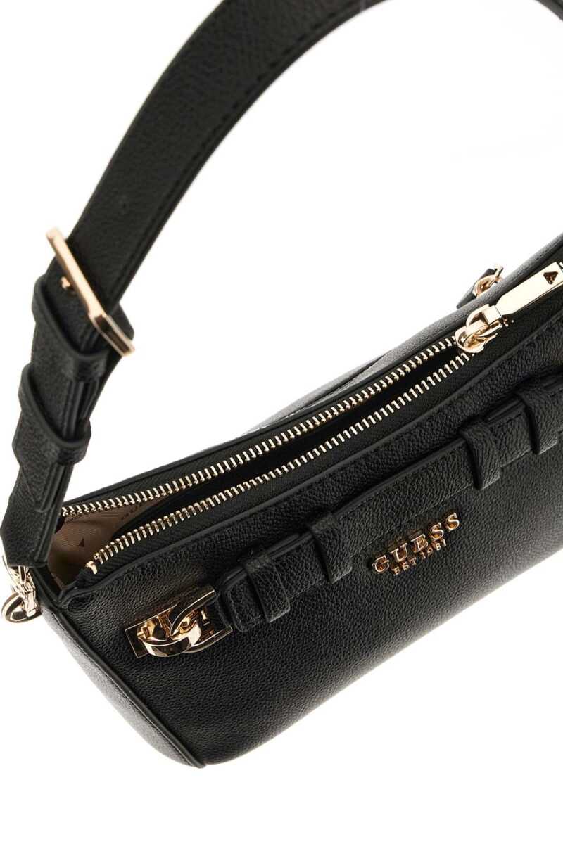 Modern ve popüler "baget" formuna sahip bu omuz çantası, minimalist ve şık bir stil sunar. Dokulu siyah poliüretan yüzeyi, ön kısmındaki yatay bant ve parlak metal toka detaylarıyla hareketli bir görünüm kazanır. Ayarlanabilir omuz askısı kişiselleştirilmiş bir konfor sunarken, arka yüzeyindeki fermuarlı cep pratik bir kullanım sağlar.