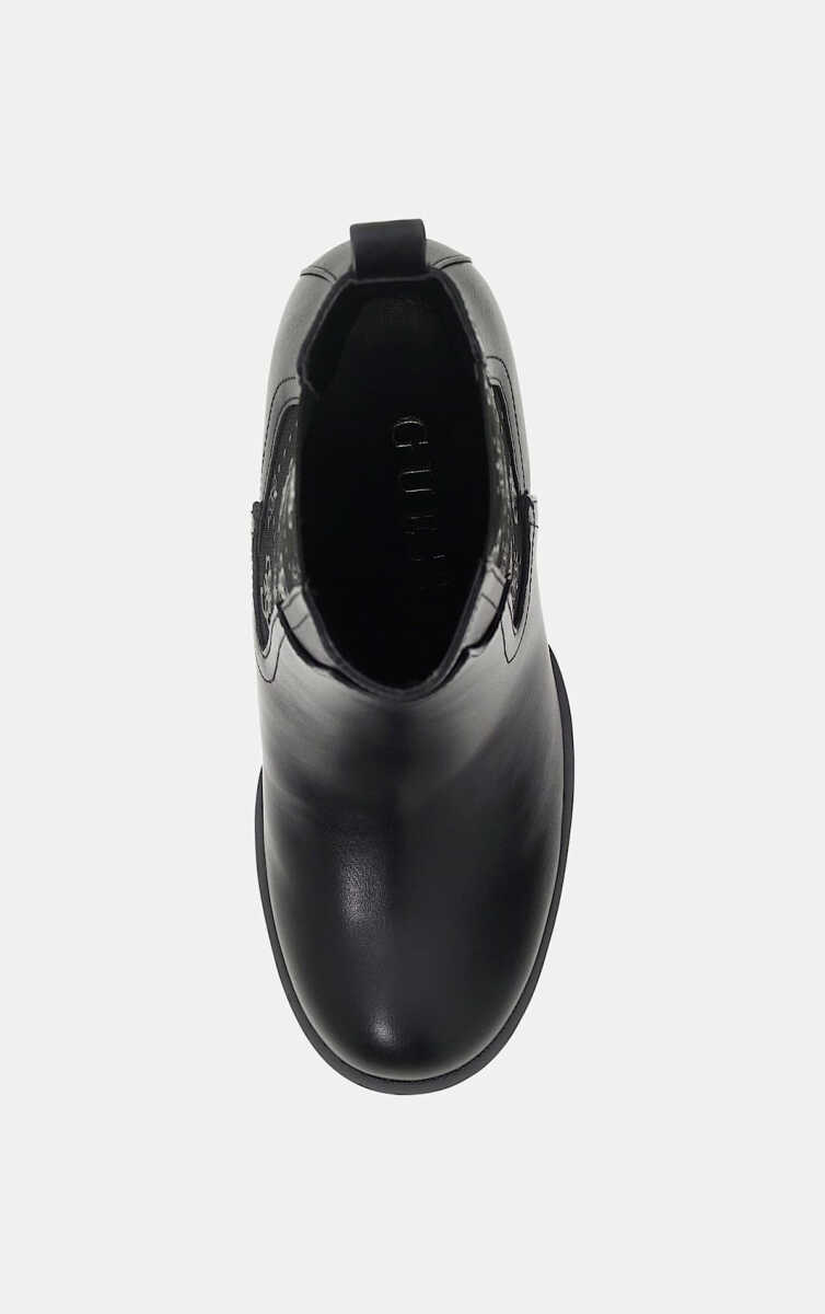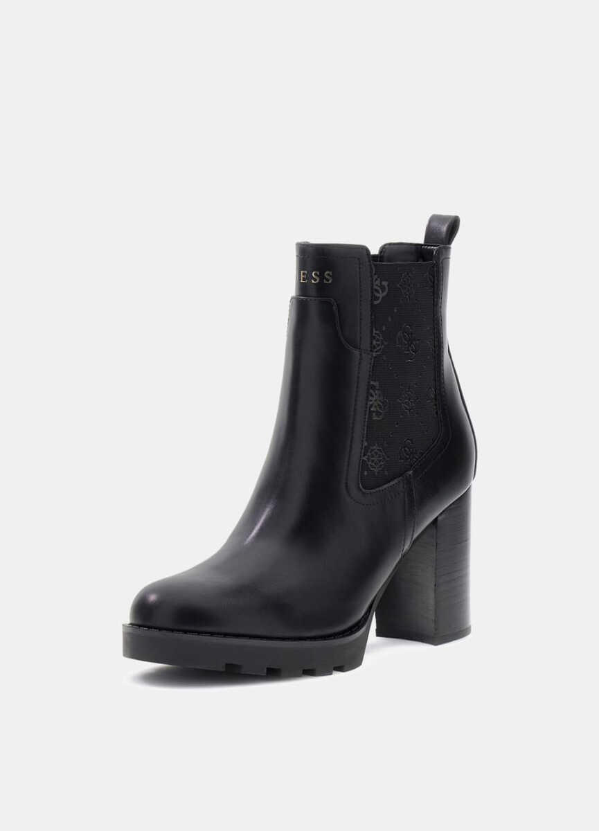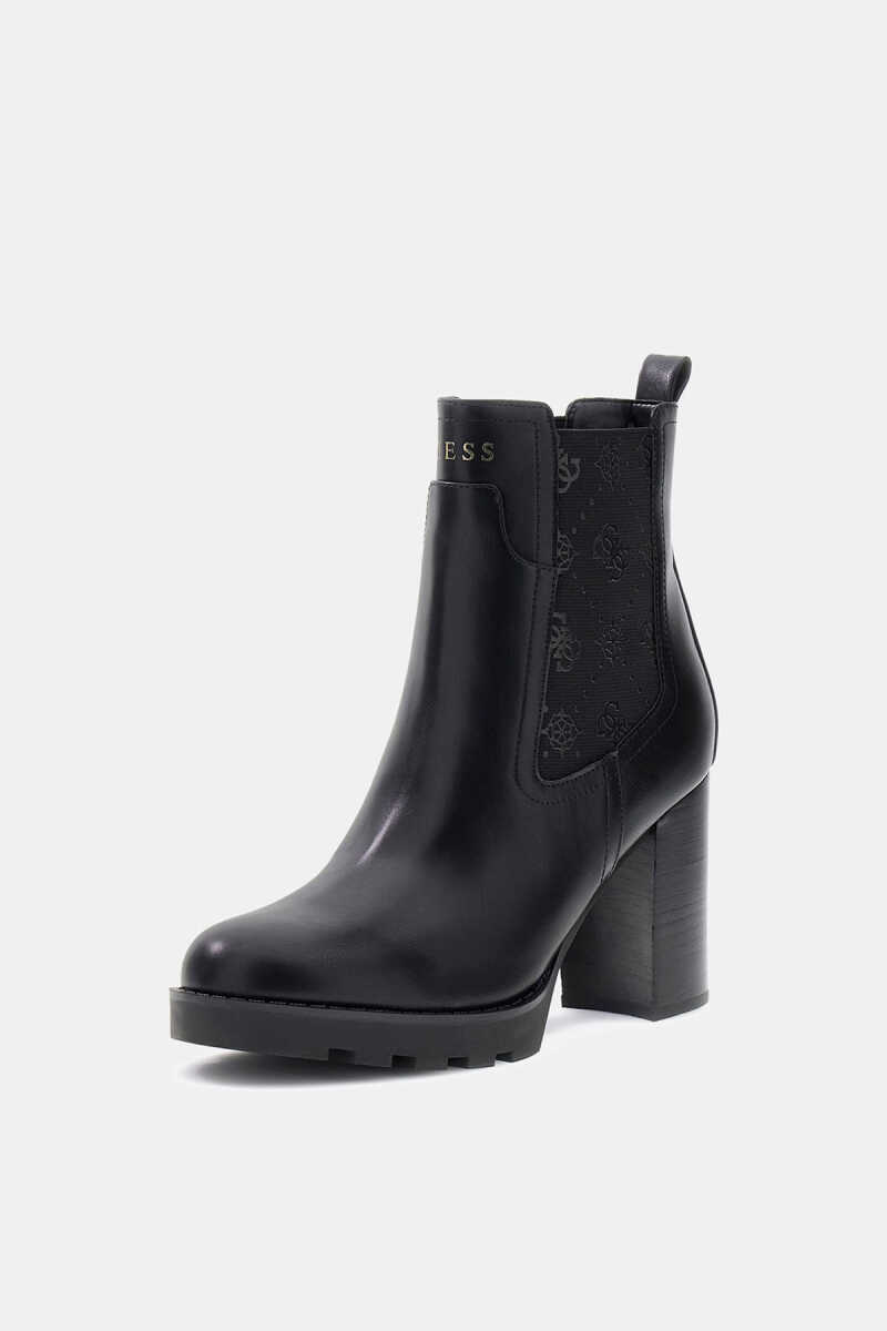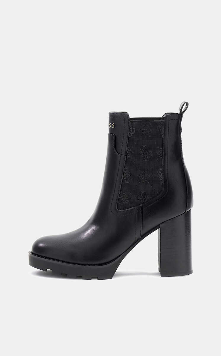 Klasik Chelsea bot stiline modern ve güçlü bir yorum getiren bu model, iddialı silüetiyle öne çıkar. Pürüzsüz siyah suni deri gövde, yanlarda yer alan tonal monogram desenli elastik panellerle birleşerek hem şık bir görünüm hem de giyim kolaylığı sunar. Yüksek blok topuğu ve platform tabanı, boyu zarifçe yükseltirken dengeli bir yürüyüş sağlar. Arkasındaki çekme halkası ve küçük metal logo gibi incelikli detaylar, botun sofistike estetiğini tamamlar.
