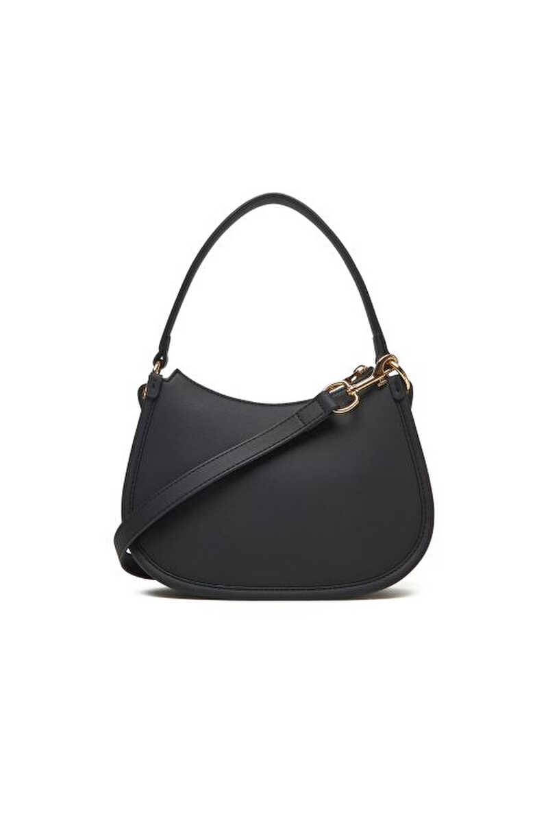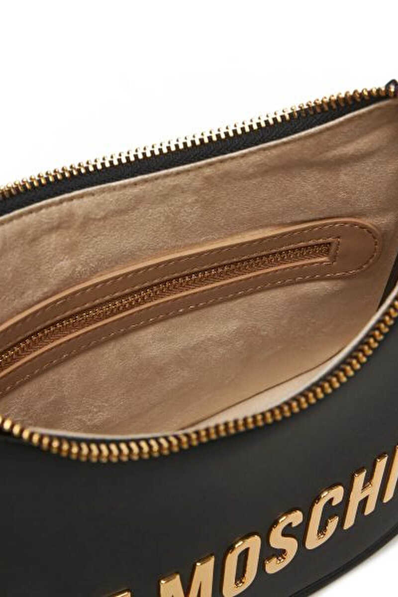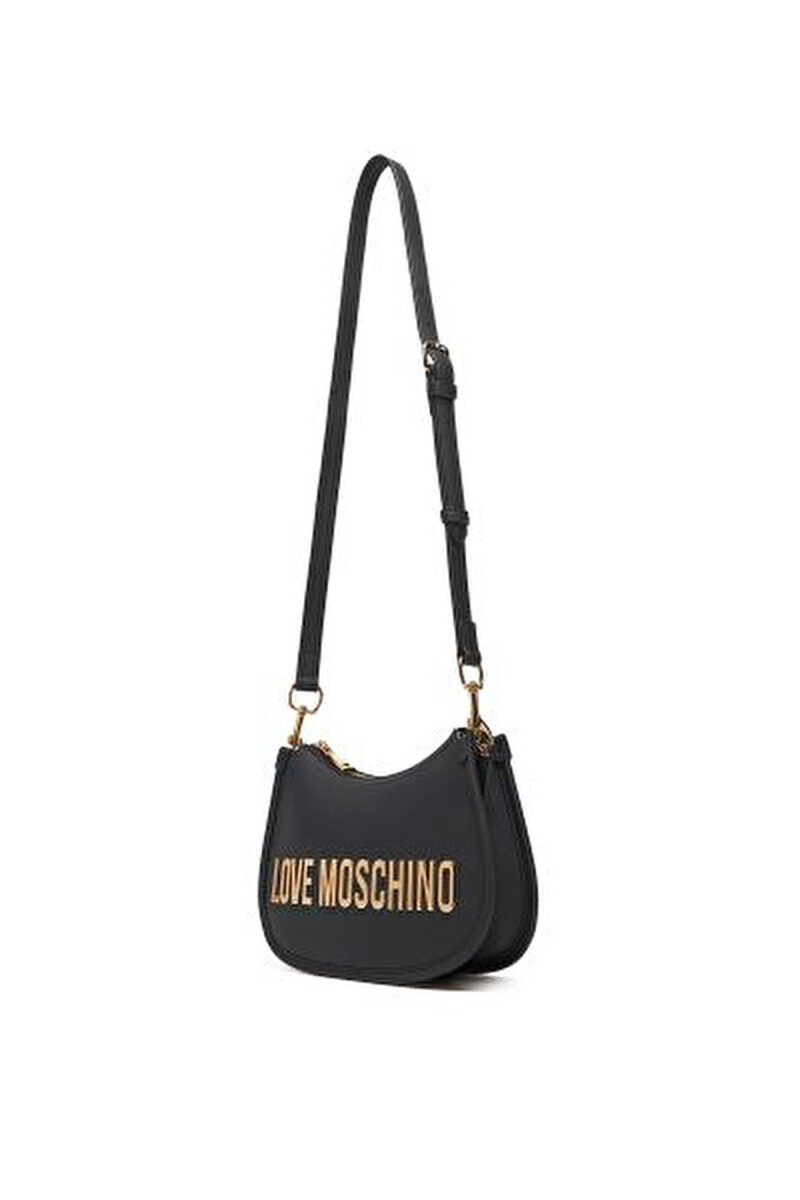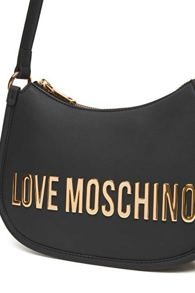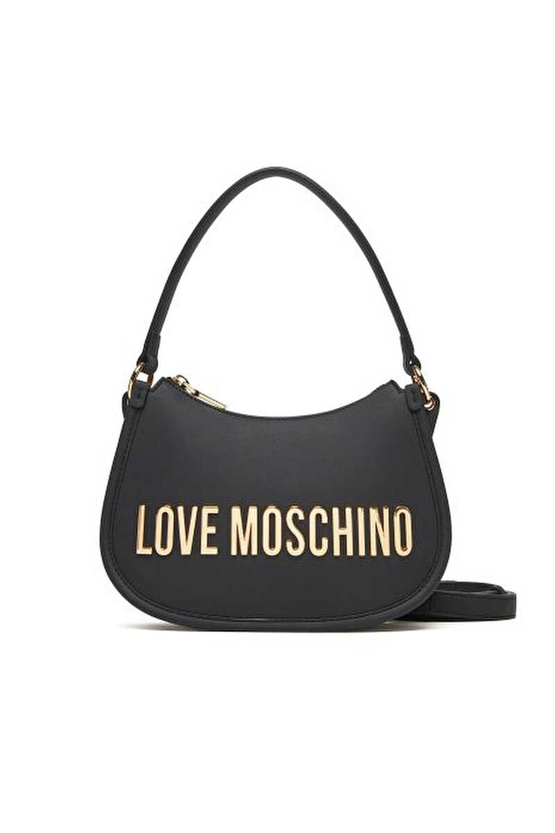 Love Moschino’nun siyah omuz çantası, ön bölümde yer alan büyük gold metal LOVE MOSCHINO logosuyla dikkat çeker.
