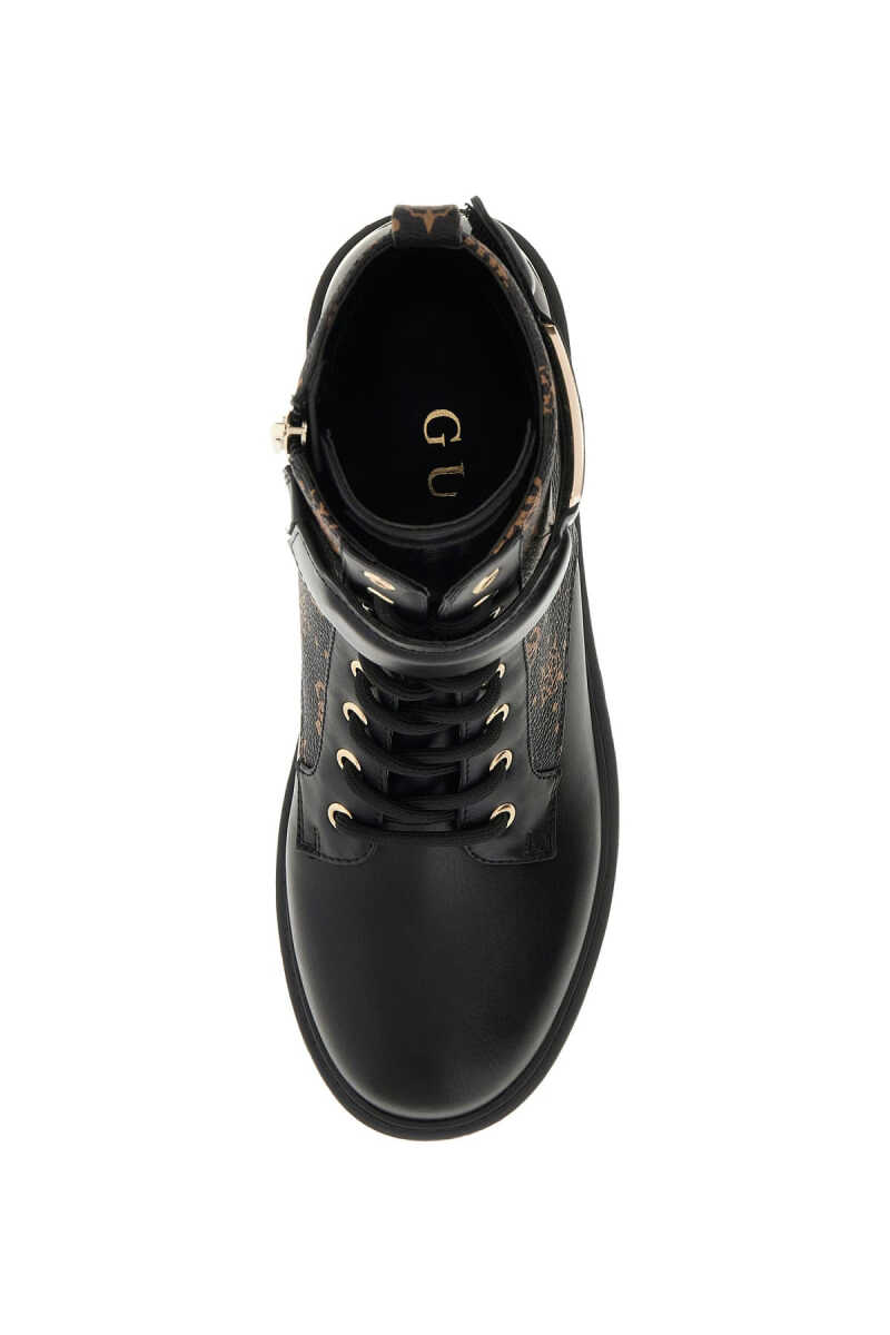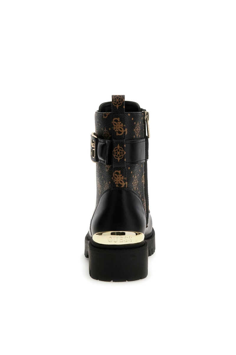 Klasik postal silüetini lüks ve modern detaylarla birleştiren bu bot, stil sahibi bir duruş sergiler. Siyah suni deri gövde, yanlardaki monogram desenli panellerle hareket kazanır. Bileği saran ve büyük bir metal harf aksesuarına sahip olan toka detaylı bant, modelin en dikkat çekici unsurudur. Topuktaki altın rengi metal plaka lüks bir vurgu yaparken, kalın traktör tabanı tasarıma güçlü bir karakter katar. İç kısmındaki fermuar ise pratik bir kullanım sunar.
