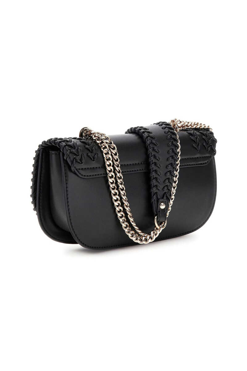 Zanaatkar dokunuşları modern tasarımla birleştiren bu omuz çantası, şıklığıyla öne çıkar. Çantanın kapak kısmını ve askısını süsleyen özel örgü detaylar, pürüzsüz siyah yüzey ile sofistike bir kontrast oluşturur. Parlak zincir askısı, çantanın klasik siyah rengiyle şık bir uyum sergiler. Ön yüzeydeki minimalist metal yazı detayı ise tasarıma son dokunuşu yapar.