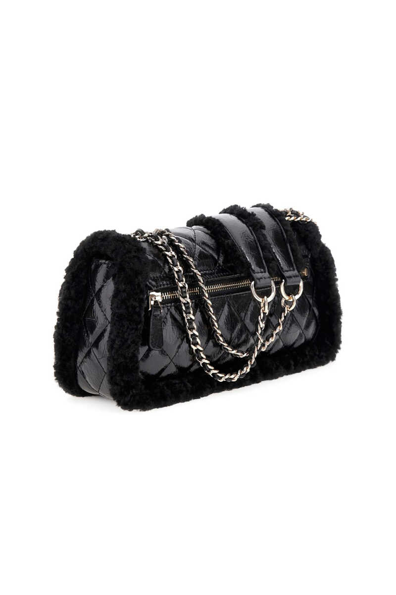 Farklı dokuları bir araya getiren bu omuz çantası, stile iddialı bir dokunuş katmak için tasarlanmıştır. Çantanın gövdesindeki parlak rugan görünümlü ve kapitone desenli yüzey, kenarlarını çevreleyen yumuşak pelüş detaylarla zengin bir kontrast oluşturur. Zincir detaylı omuz askısı ve ön yüzeydeki minimalist metal yazı, çantanın modern ve şık karakterini tamamlar.