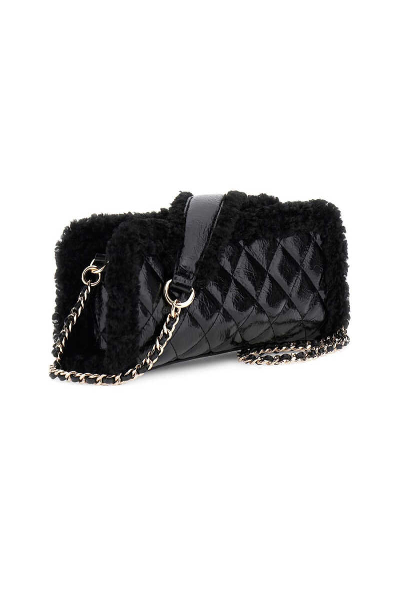 Farklı dokuları bir araya getiren bu omuz çantası, özgün ve şık bir stil sunar. Çantanın parlak rugan görünümlü kapitone gövdesi, kenarlarını çevreleyen yumuşak pelüş detaylarla zengin bir kontrast oluşturur. Zincir detaylı omuz askısı ve ön yüzeydeki metal yazı detayı, çantanın modern karakterini tamamlar.