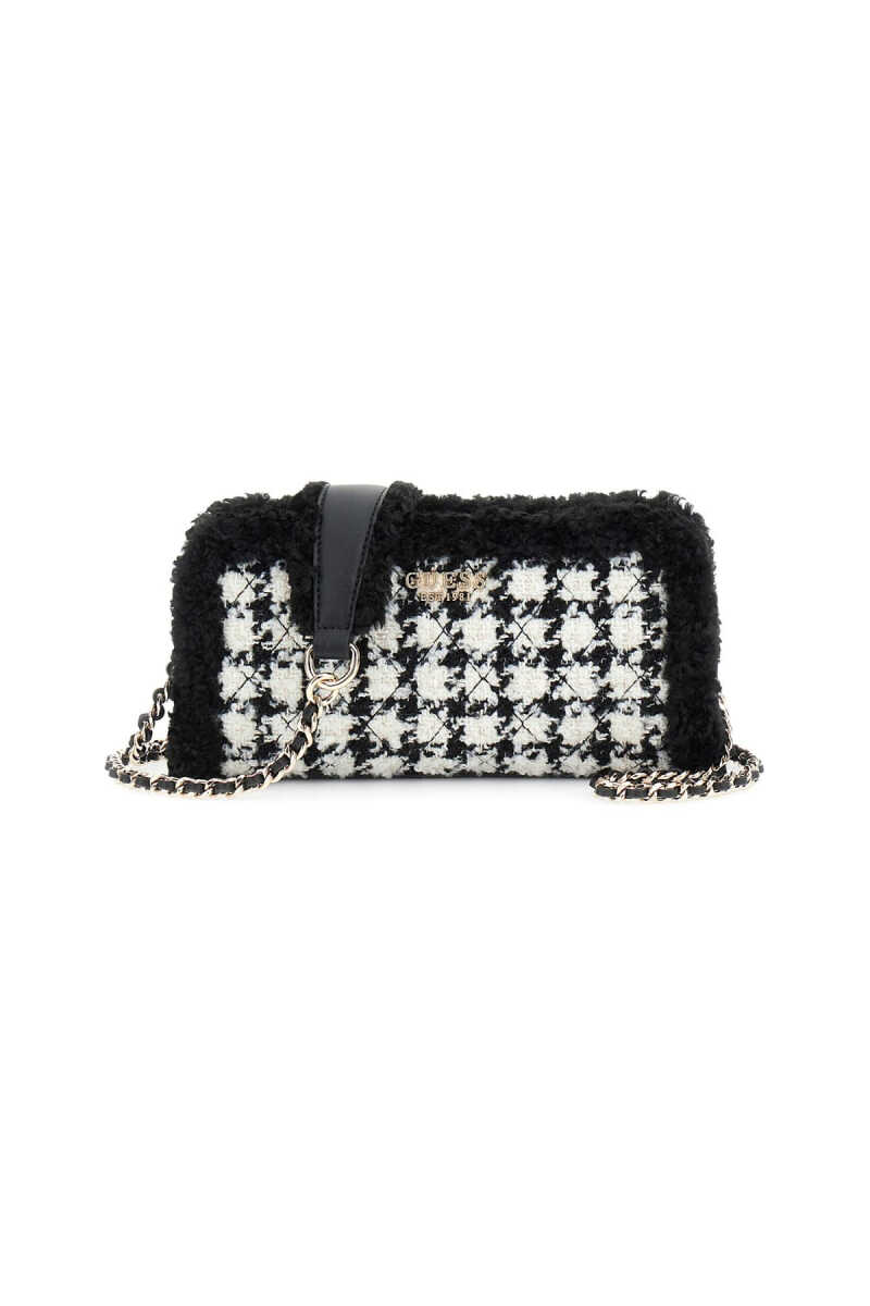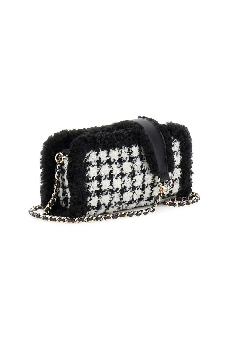 Klasik ve dokulu bir tasarıma sahip bu omuz çantası, yün karışımlı kumaşıyla stiline sıcak bir dokunuş katar. Zamansız kazayağı deseni, çantanın kenarlarını çevreleyen yumuşak siyah pelüş şeritlerle zenginleştirilmiştir. Zincir detaylı omuz askısı ve ön yüzeydeki metal yazı detayı, çantanın şık ve modern karakterini tamamlar.