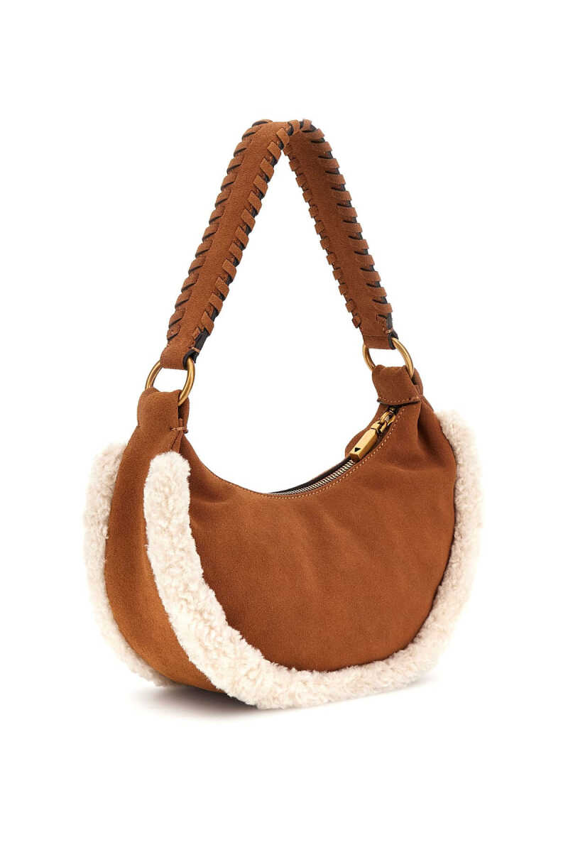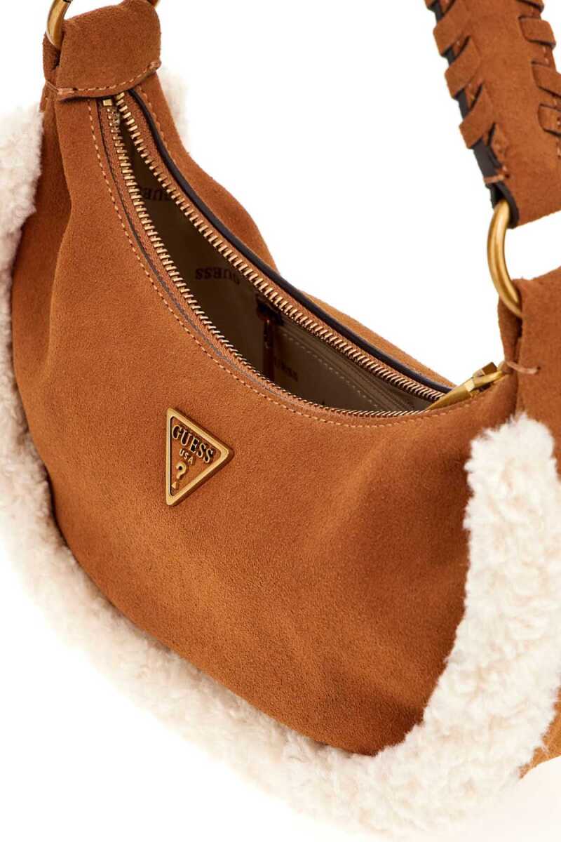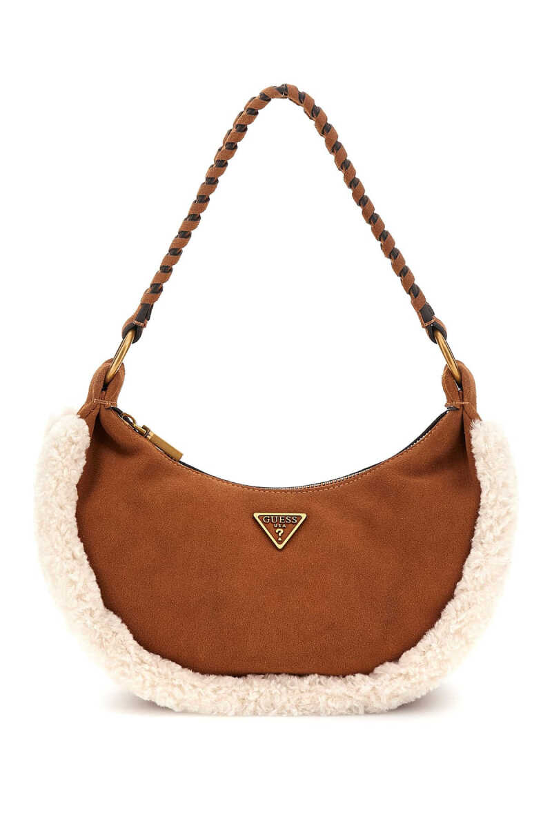 Yumuşak ve dokulu bir tasarıma sahip bu omuz çantası, %100 gerçek süet derinin zengin hissini, kürk görünümlü pelüş detaylarla birleştirir. Popüler yarım ay formundaki çantanın kenarlarını çevreleyen kırık beyaz pelüş şerit, taba rengi süet ile şık bir kontrast oluşturur. Omuz askısındaki özenli örgü detayı zanaatkar bir dokunuş katarken, ön yüzeydeki üçgen formlu metal aksesuar tasarıma zarif bir imza atar.