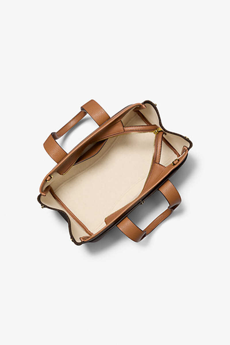 Michael Kors'un Sm Ew Satchel modeli, markanın ikonik kahverengi monogram desenini taba rengi deri detaylarla birleştirerek zamansız bir şıklık sunar. Hem çift el sapı hem de ayarlanabilir uzun omuz askısı ile çok yönlü bir kullanım sağlayan bu çanta, geniş iç hacmiyle günlük ihtiyaçlarınız için idealdir. Ön kısımdaki parlak altın rengi MK logo charm detayı, tasarıma lüks ve tanınır bir imza katıyor.