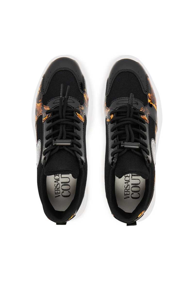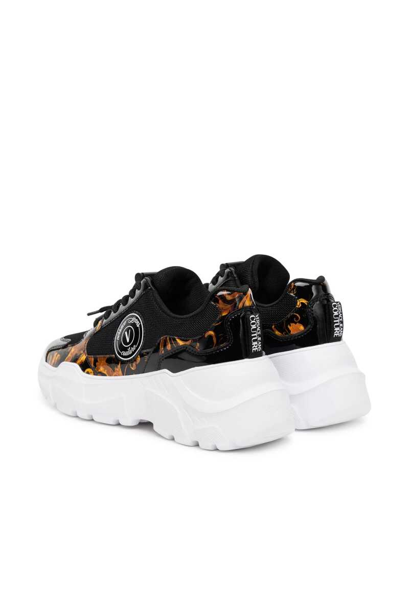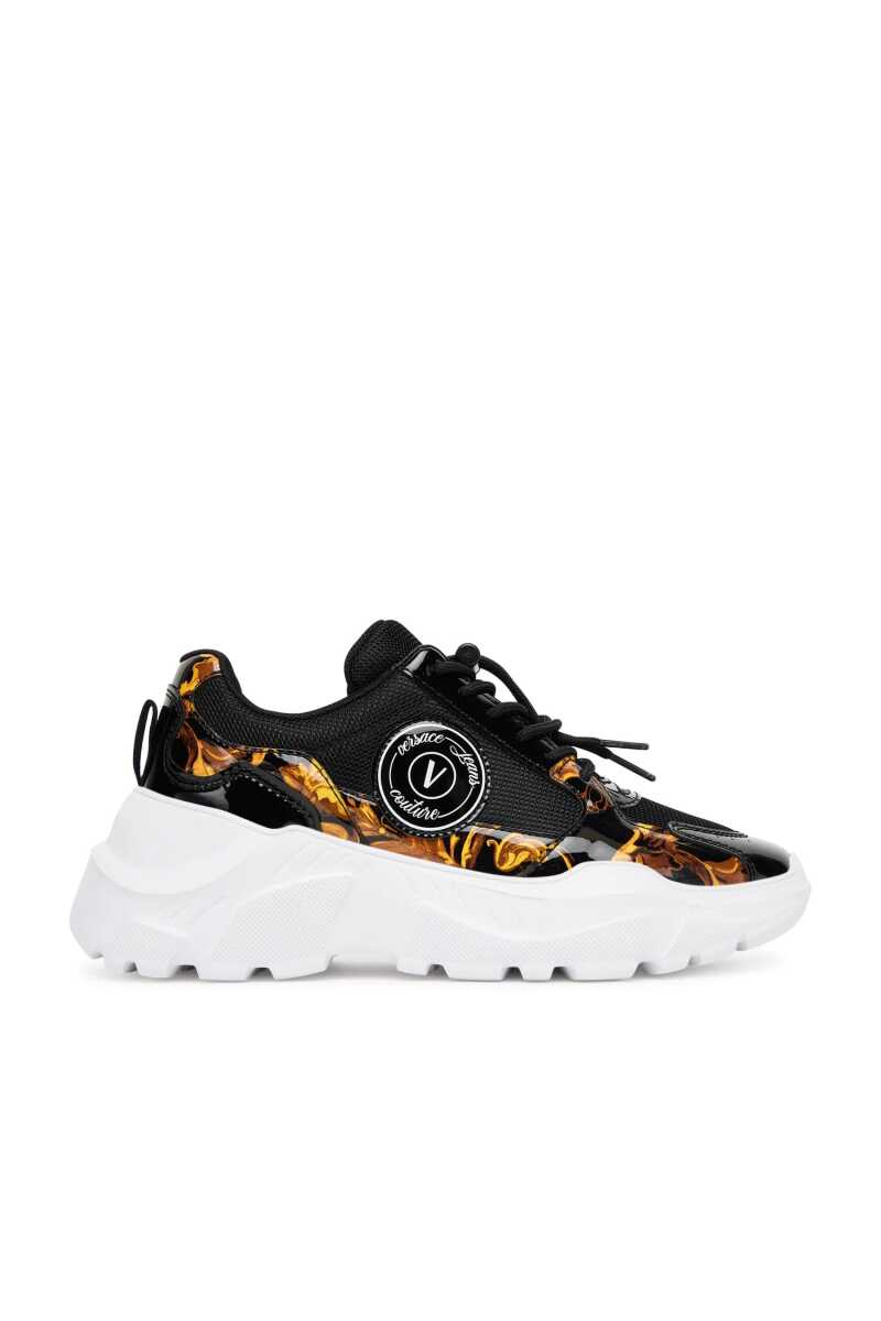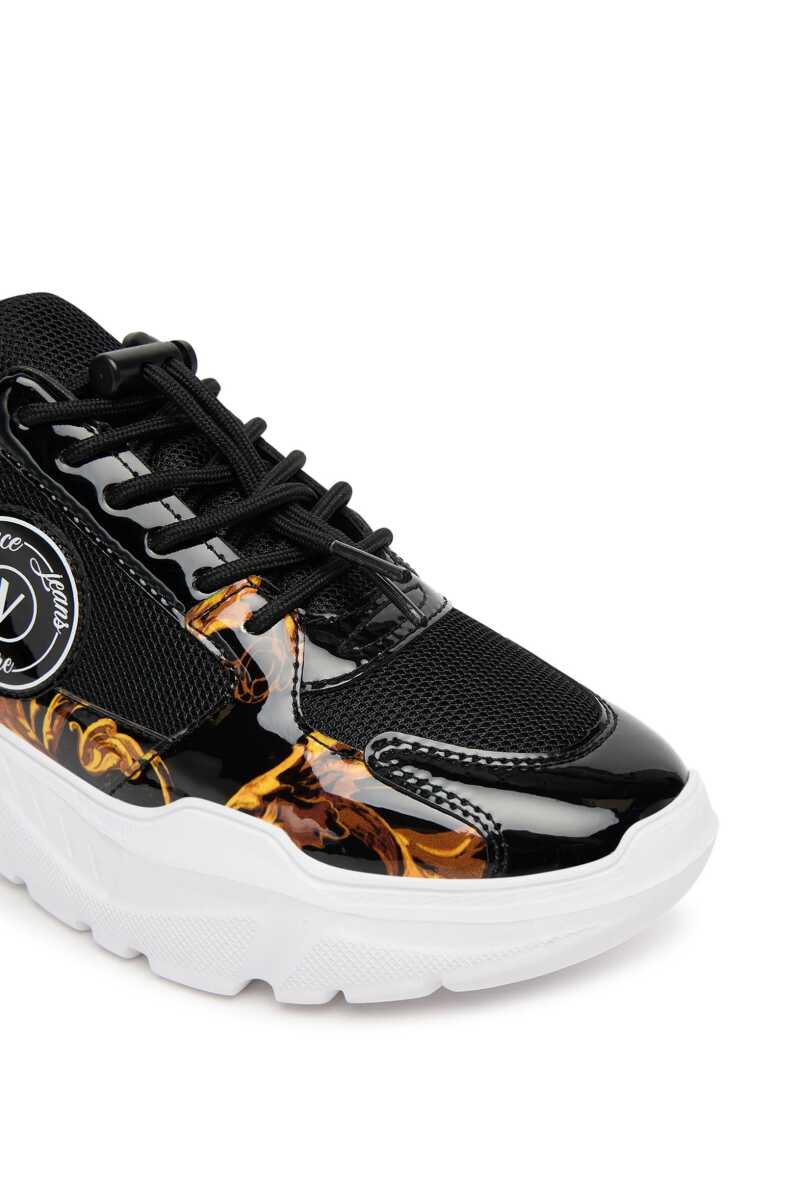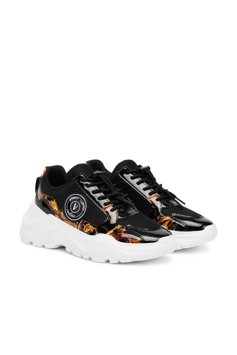 Göz alıcı tasarımıyla adımlarınıza stil katacak bu sneaker, dinamik ve modern bir görünüm sunuyor. Siyah file kumaşın, parlak siyah rugan ve markanın ikonik altın sarısı barok desenli rugan detaylarıyla buluştuğu bu ayakkabı, cesur bir estetik yaratır. Yan kısmındaki yuvarlak logo yaması ve topuktaki dikey yazı şeritleri tasarıma imza atarken, hacimli kalın beyaz Phylon tabanı hem güncel bir trendi yansıtır hem de gün boyu üstün konfor sağlar. Klasik bağcıklı yapısıyla ayağınıza tam uyum sağlayan bu sneaker, enerjik ve stil sahibi kombinlerinizin vazgeçilmezi olacak.