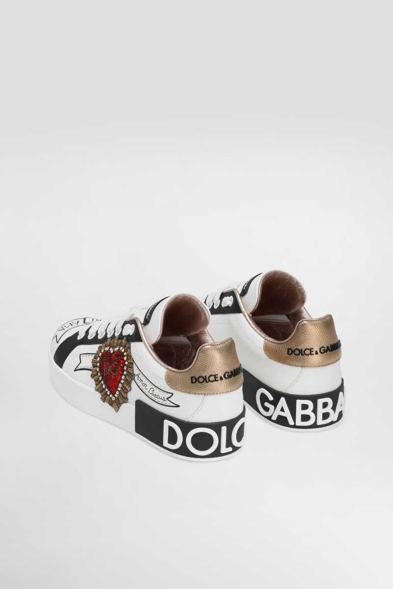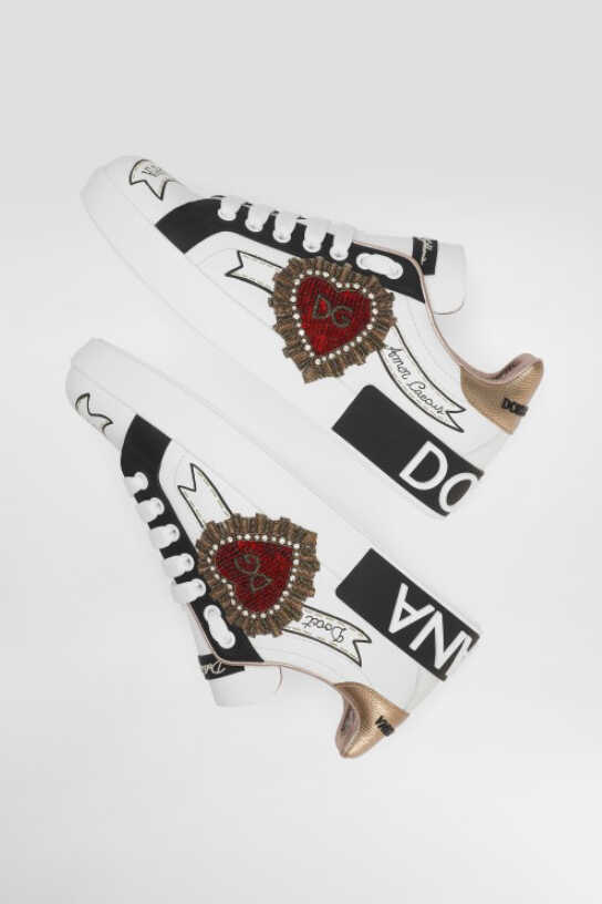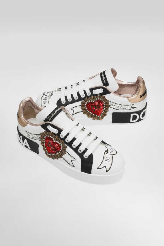 İtalyan lüksünü ve maksimalist tasarımı bir araya getiren bu sneakers, sanatsal detaylarıyla adımlarınıza karakter katıyor. Üstün kaliteli beyaz dana derisi üzerinde yer alan büyük, parlak taş işlemeli ve boncuklu kalp aplikesi, ayakkabının odak noktasını oluşturur. Tasarım, ayakkabının çeşitli yerlerine dağılmış yazı baskıları, kontrast siyah paneller ve metalik roze altın rengi topuk pedi ile zenginleştirilmiştir. Kauçuk tabanını çevreleyen büyük harfli logo detayları, bu göz alıcı ve lüks ayakkabının cesur stilini tamamlar.