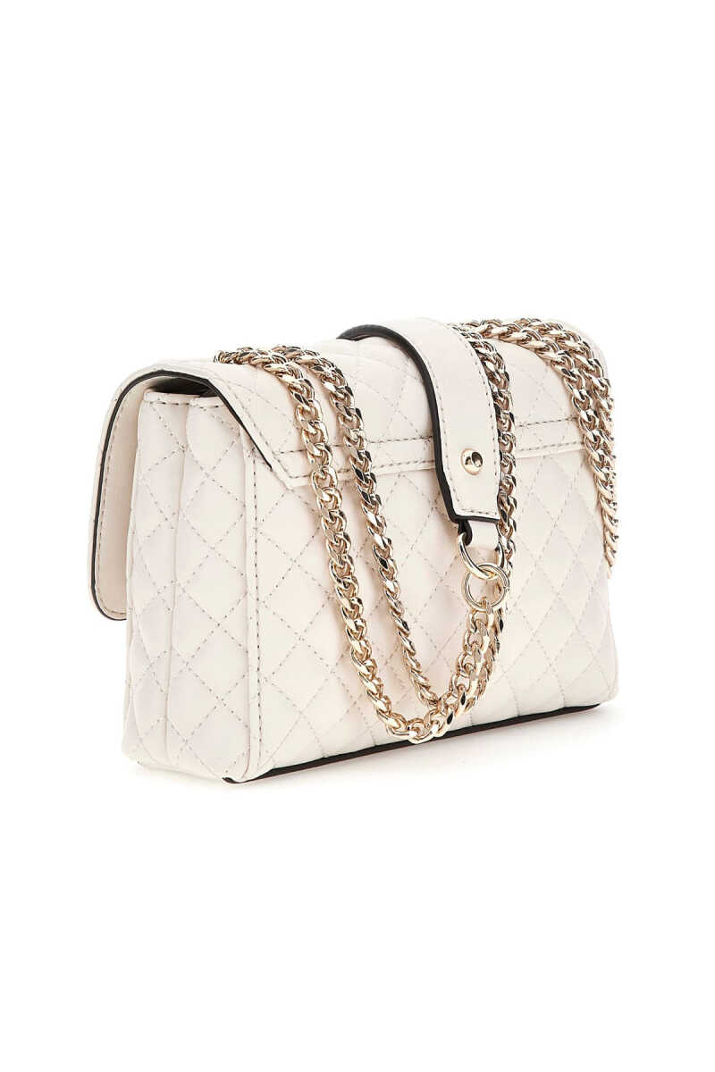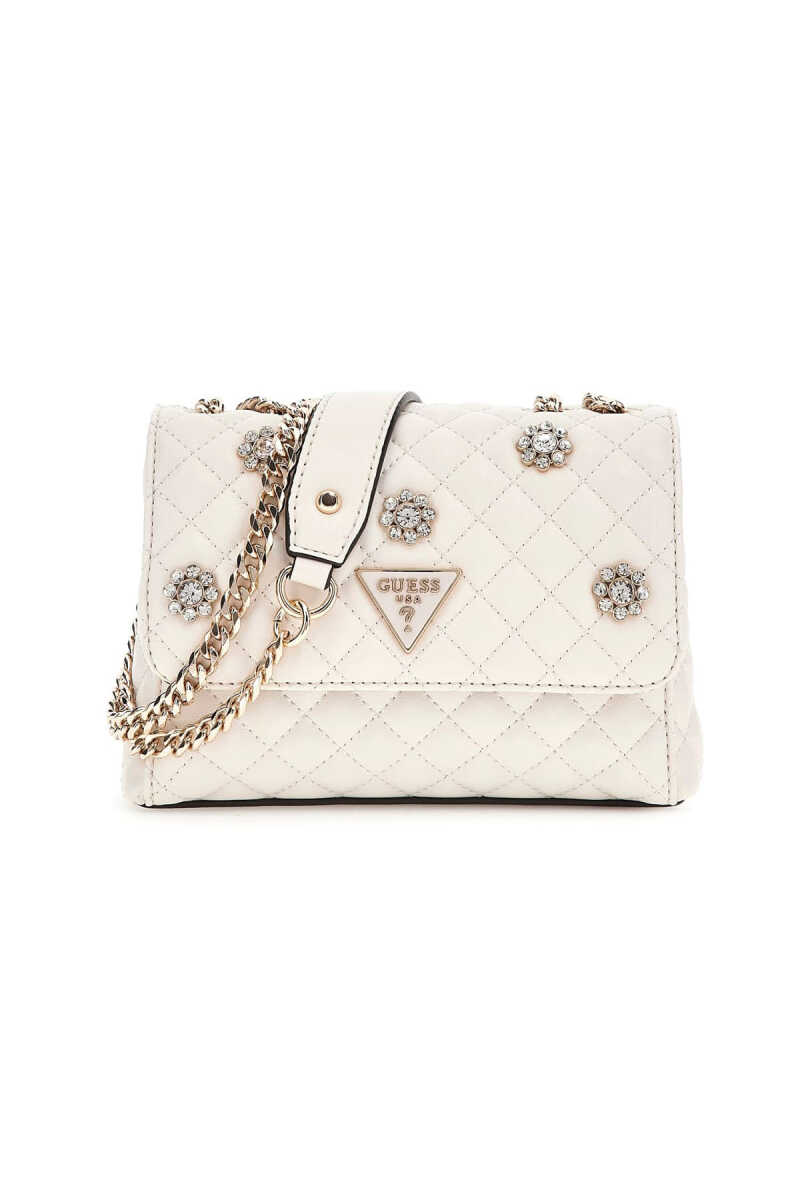 Göz alıcı ve şık bir tasarıma sahip bu omuz çantası, klasik kapitone deseni modern detaylarla birleştirir. Kırık beyaz kapitone yüzeyi, üzerine işlenmiş parlak kristal taşlı çiçek aplikeleri ile zenginleştirilerek ışıltılı bir görünüm kazanmıştır. Ön kapak üzerindeki üçgen formlu metal aksesuar ve zincir detaylı omuz askısı, çantanın zarif tasarımını tamamlar.