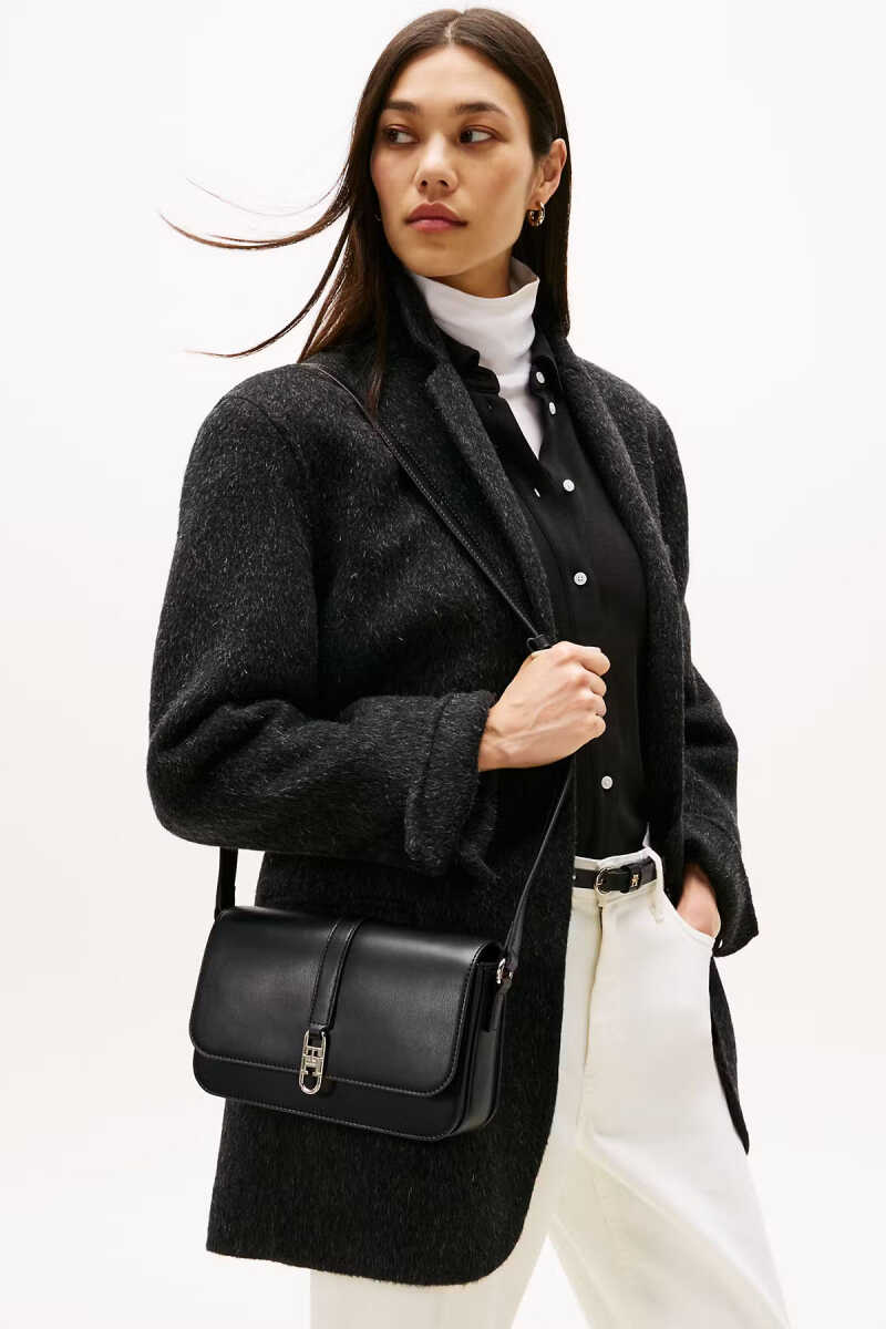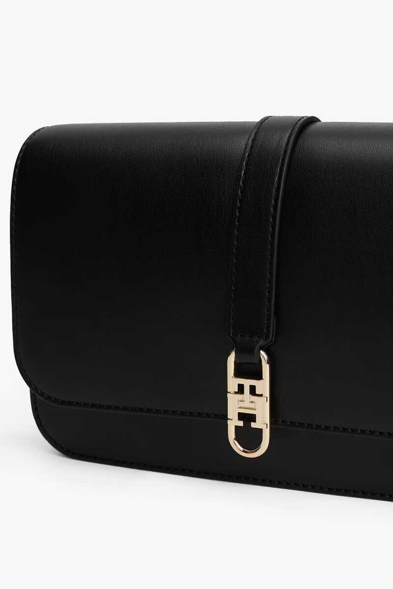 • Tommy Hilfiger'ın TH LIBRE koleksiyonuna ait bu kapaklı çapraz askılı çanta, klasik tasarımı modern detaylarla birleştiriyor. Siyah rengin şıklığı, çantanın ön yüzündeki altın rengi TH monogram kilit ile tamamlanarak zarif bir stil yaratır. Ayarlanabilir uzun askısı sayesinde rahat bir kullanım sunarken, mıknatıslı kapak ve fermuarlı iç gözü eşyalarınızı güvende tutar.