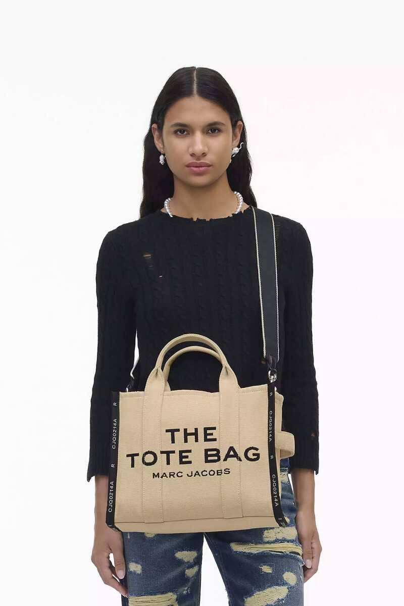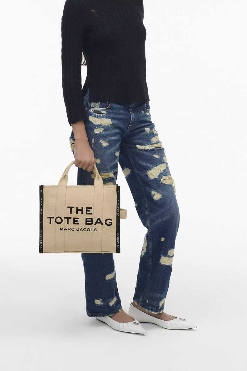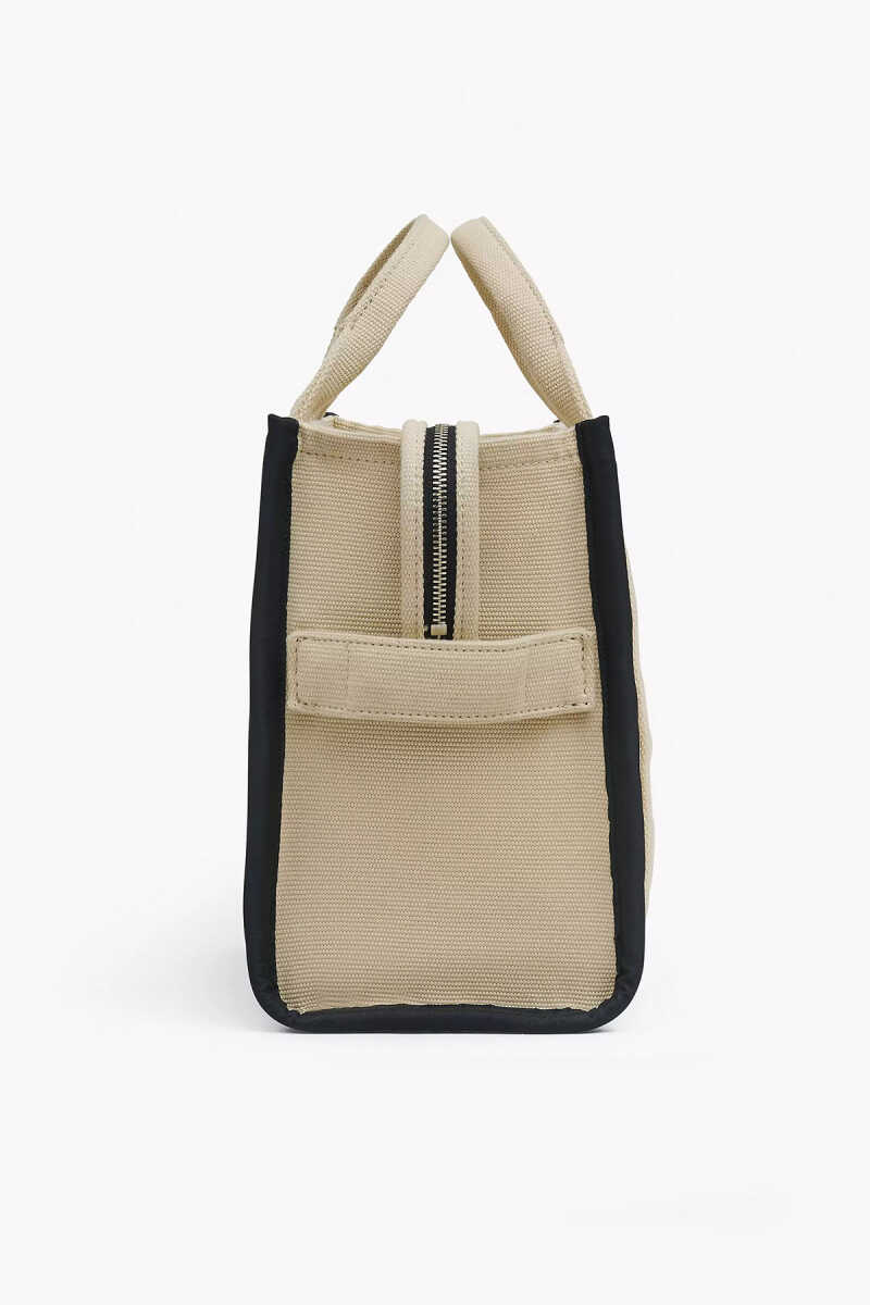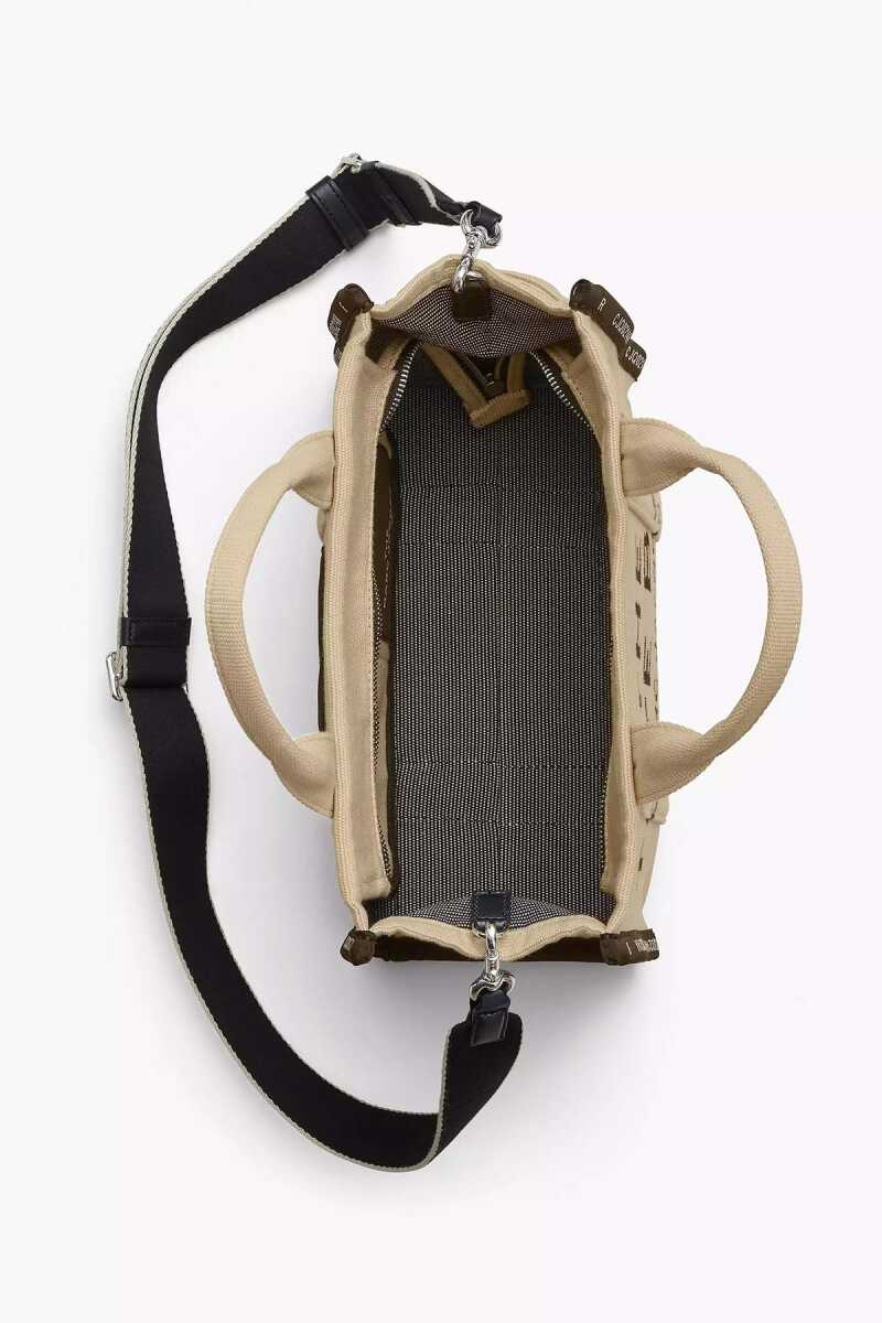 Marc Jacobs'ın ikonik "The Tote Bag" modeli, dayanıklı pamuk ve polyester karışımlı kanvas kumaşı ile öne çıkıyor. Bej zemin üzerine siyah "THE TOTE BAG MARC JACOBS" baskısı, çantaya anında tanınır bir kimlik kazandırır. Bu çanta, 12 cm'lik el askılarıyla elde veya çıkarılabilir/ayarlanabilir siyah dokuma askısıyla omuzda ya da çapraz olarak çok yönlü bir kullanım sunar. Üstten fermuarlı kapaması, eşyalarınız için güvenli bir saklama alanı sağlar.