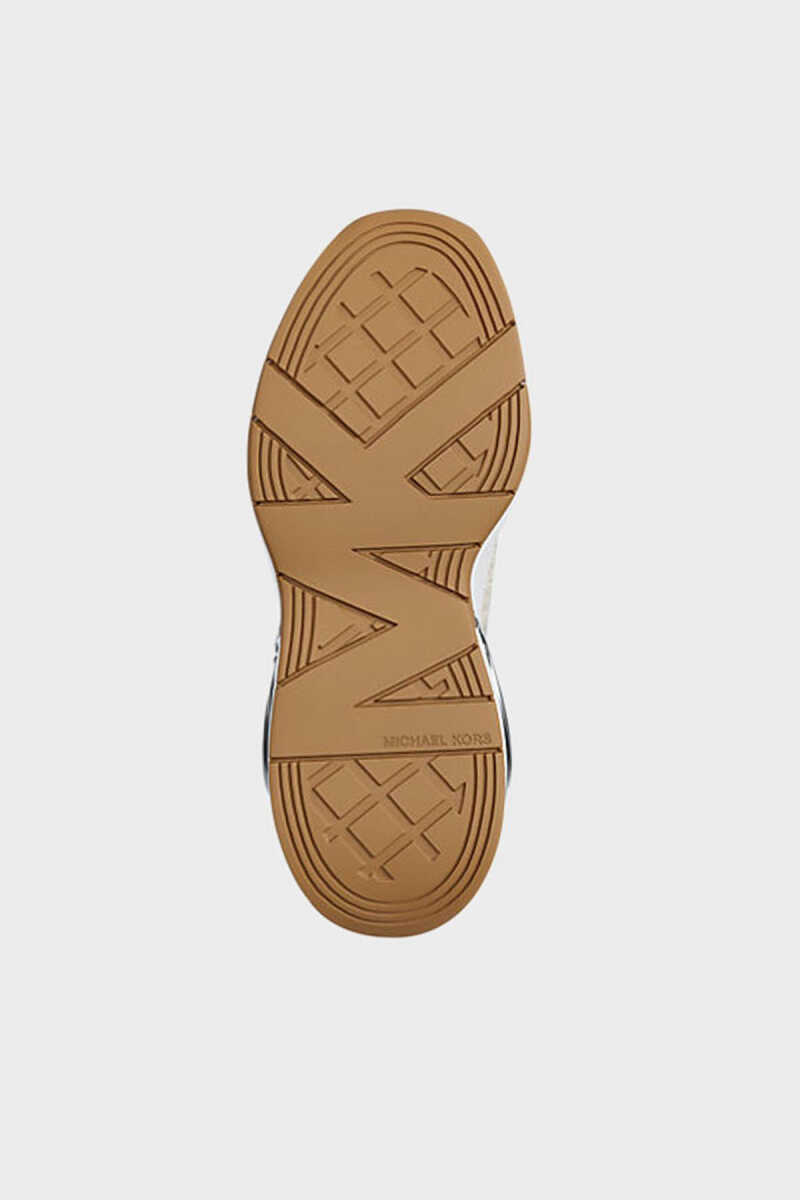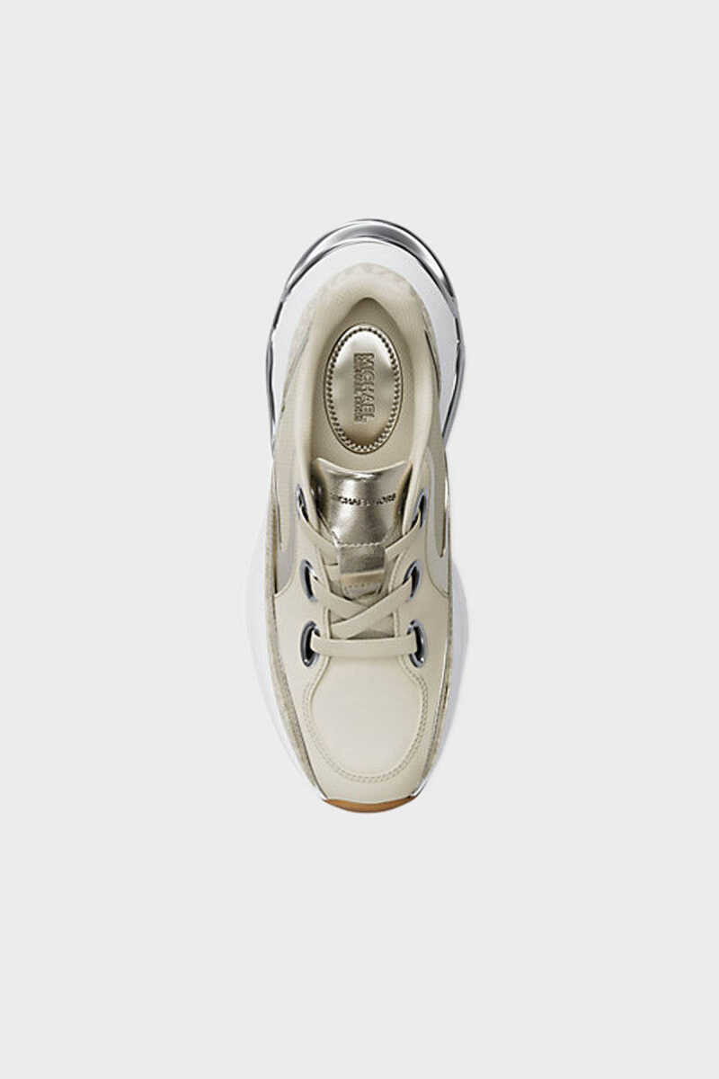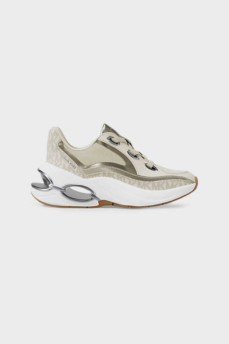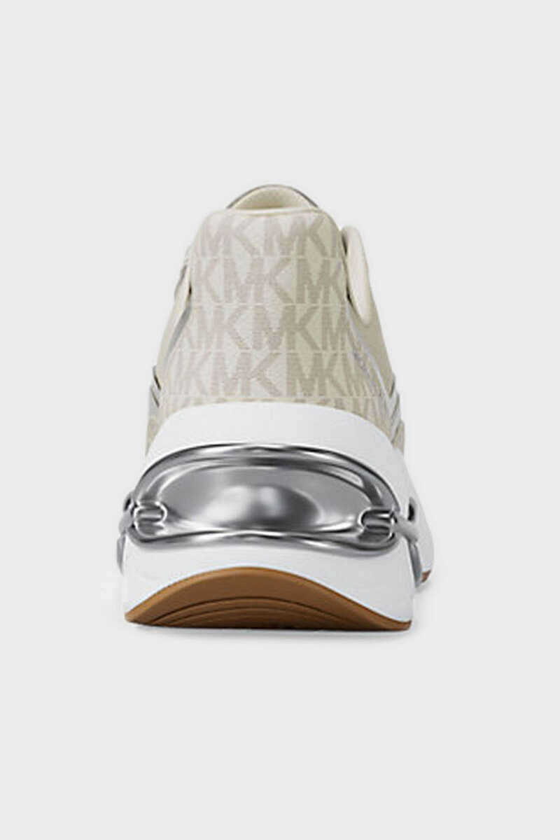 Michael Kors Tonı Trainer sneaker, markanın ikonik monogram deseni ve fütüristik tasarım öğelerini bir araya getiriyor. Ekru ve bej tonlarındaki saya, nefes alabilen file paneller ve parlak metalik detaylarla zenginleştirilmiştir. Ayakkabının en dikkat çekici özelliği, topuk kısmındaki heykelsi metalik parçadır. Hem sportif hem de iddialı bir stil sunan bu Michael Kors sneaker, günlük kombinlerinize dinamik bir dokunuş katacak.