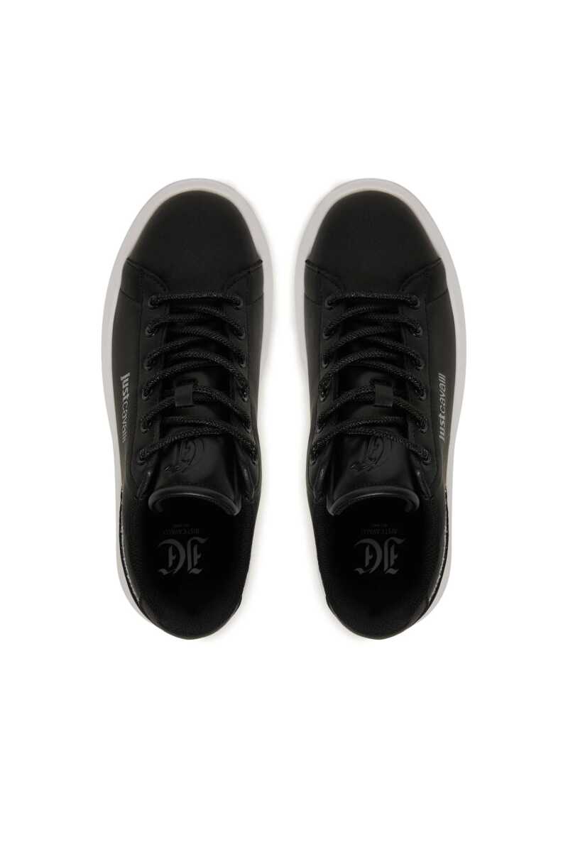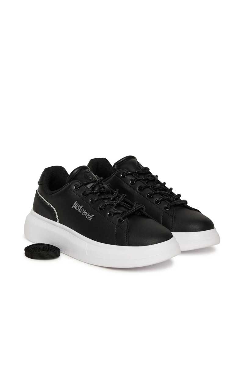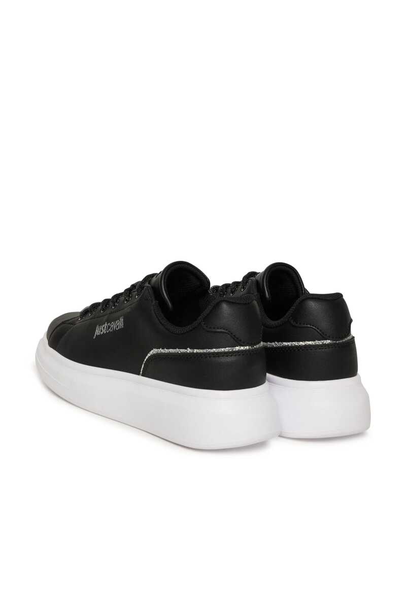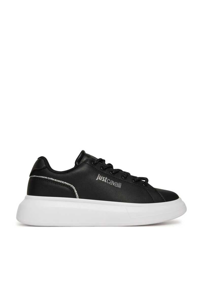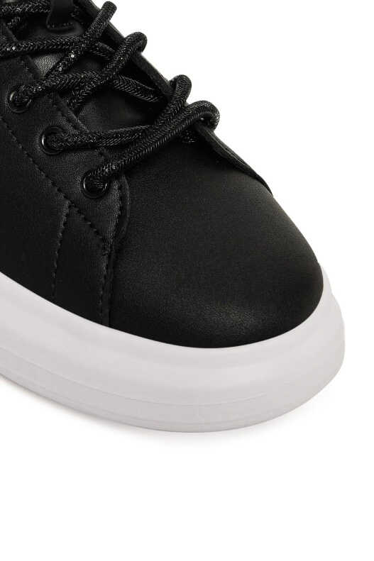 Klasik siyah sneaker'a göz alıcı bir yorum getiren bu ayakkabı ile adımlarınıza ışıltı katın. Pürüzsüz yüzeyi, yan kısmındaki gümüş rengi yazı logosu, parıltılı siyah bağcıkları ve topuk kısmını çevreleyen simli şerit detayıyla zenginleştirilmiştir. Deri ve poliüretan karışımı malzemesiyle kalite ve konfor sunarken, kalın beyaz Phylon tabanı hem modern bir görünüm sağlar hem de gün boyu rahat adımlar atmanızı destekler. Gündelik şıklığınıza sofistike bir dokunuş katacak bu sneaker, her kombininize kolayca uyum sağlayacak.